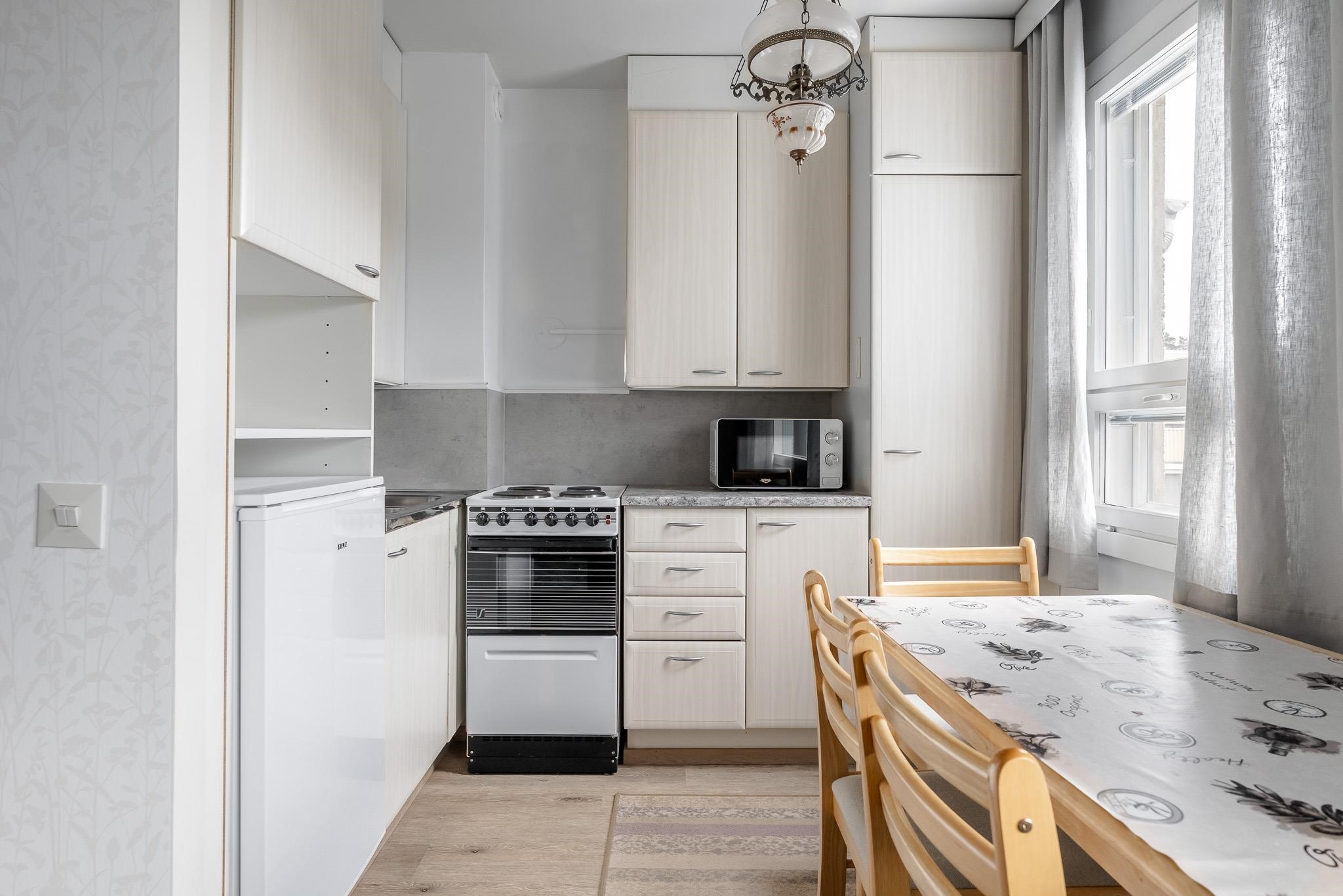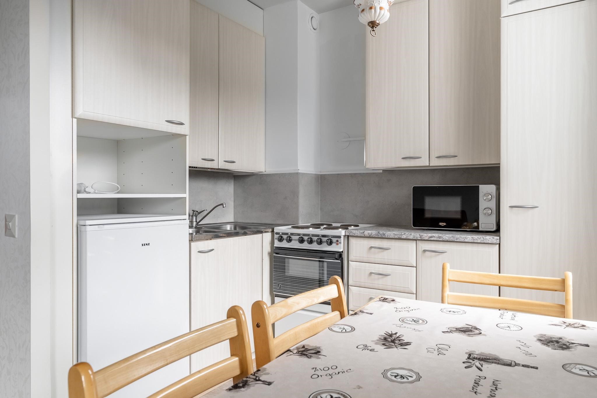 - Jääkaappi, sähköliesi, kaapistot, kiinteät valaisimet.