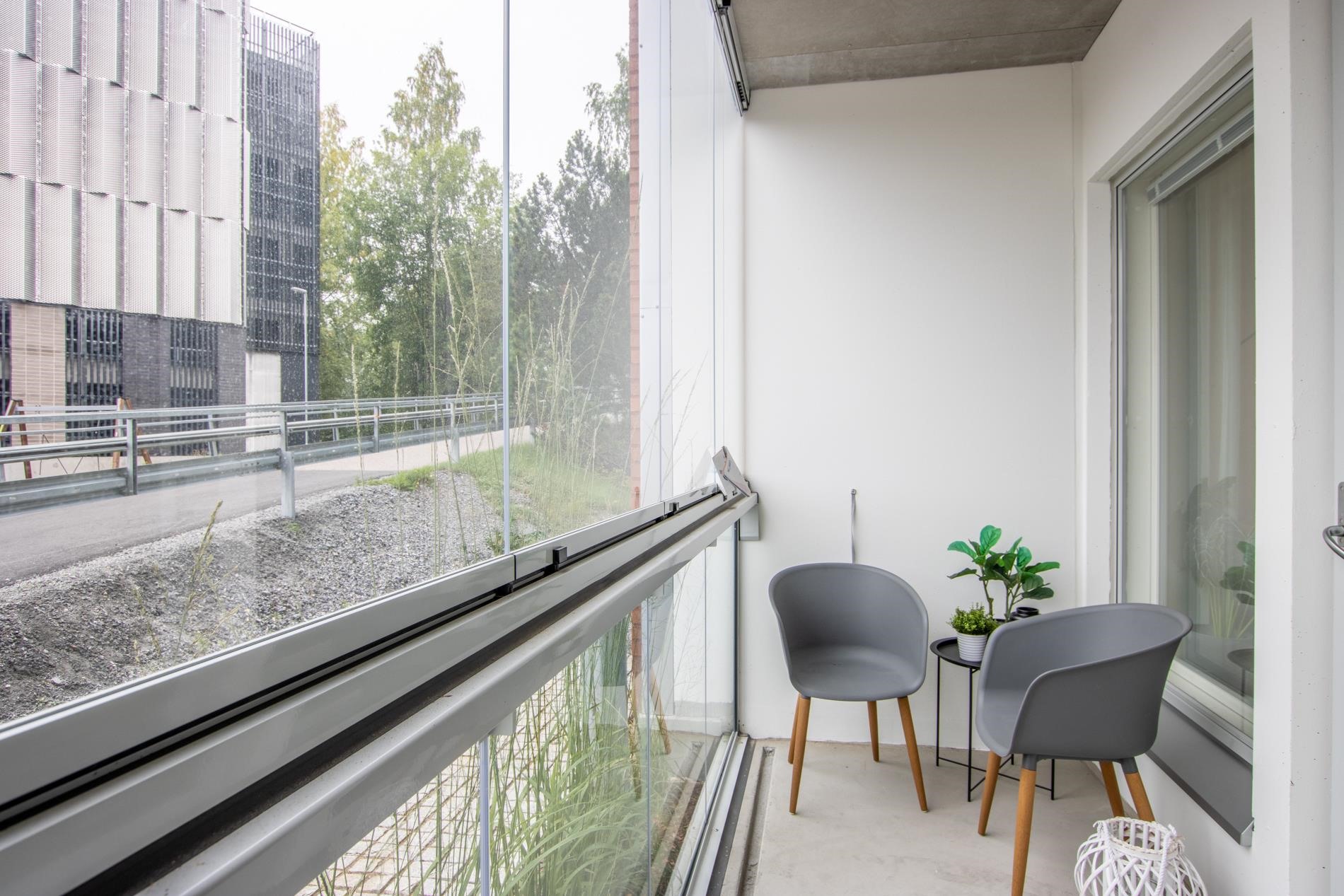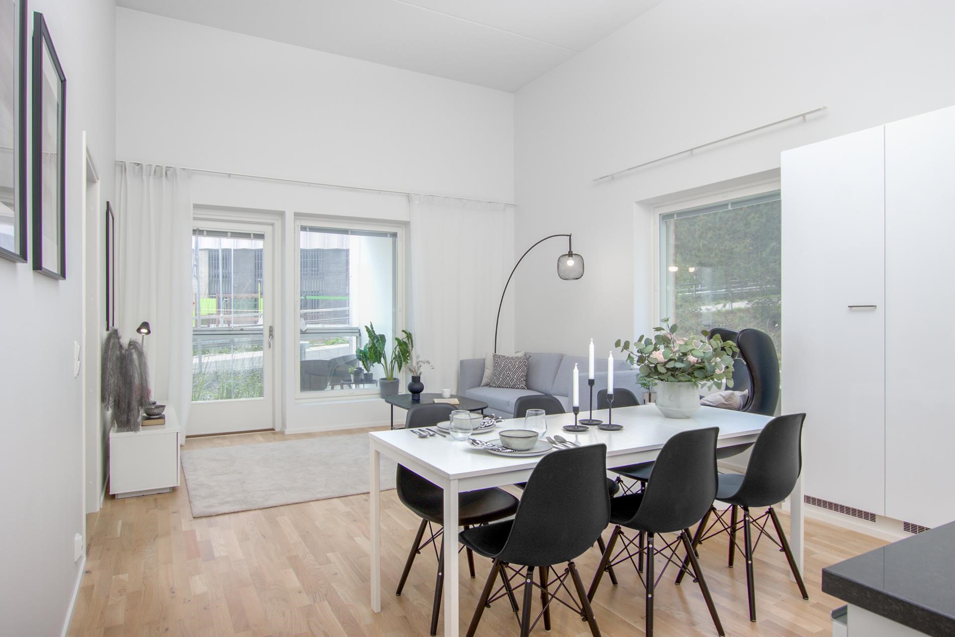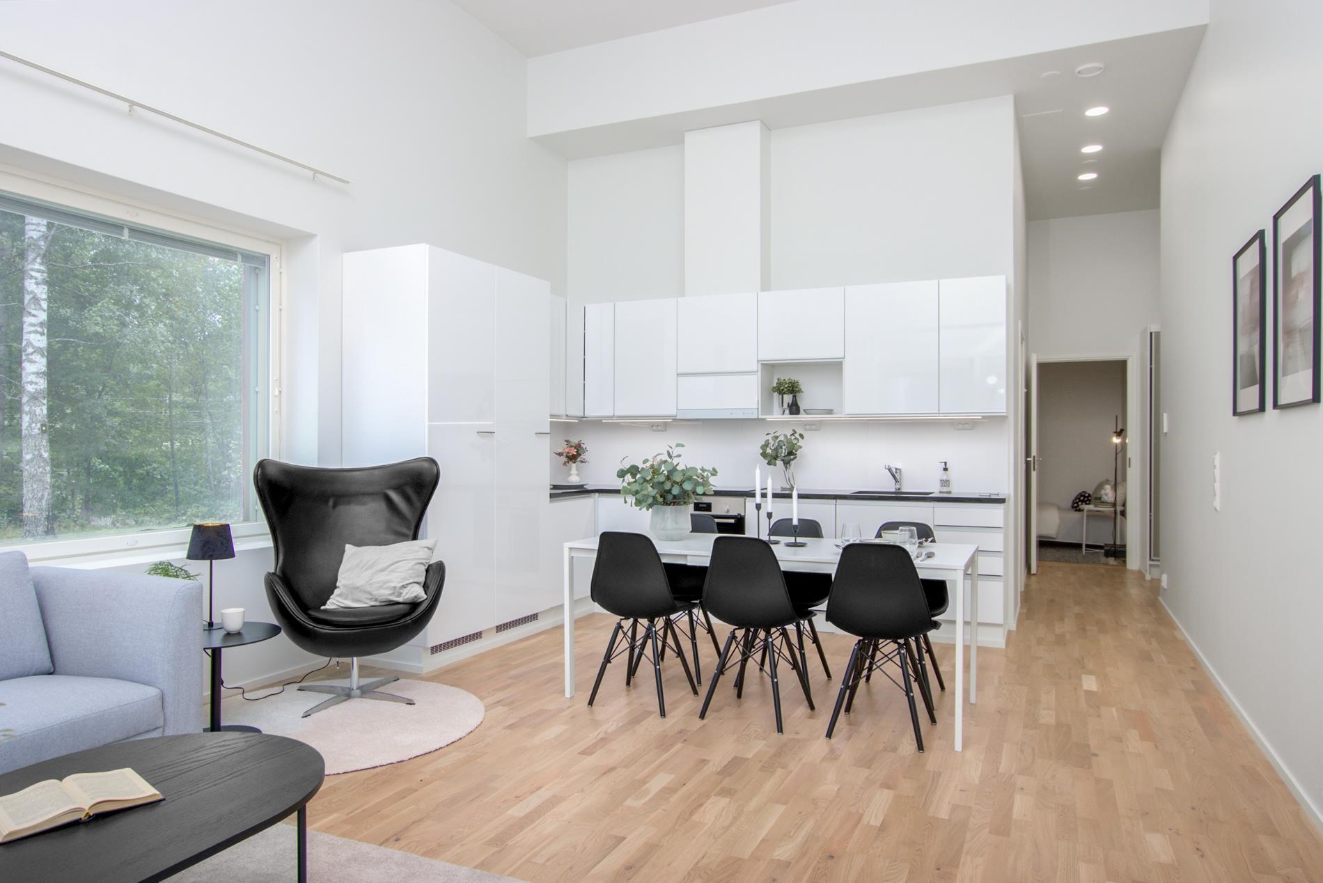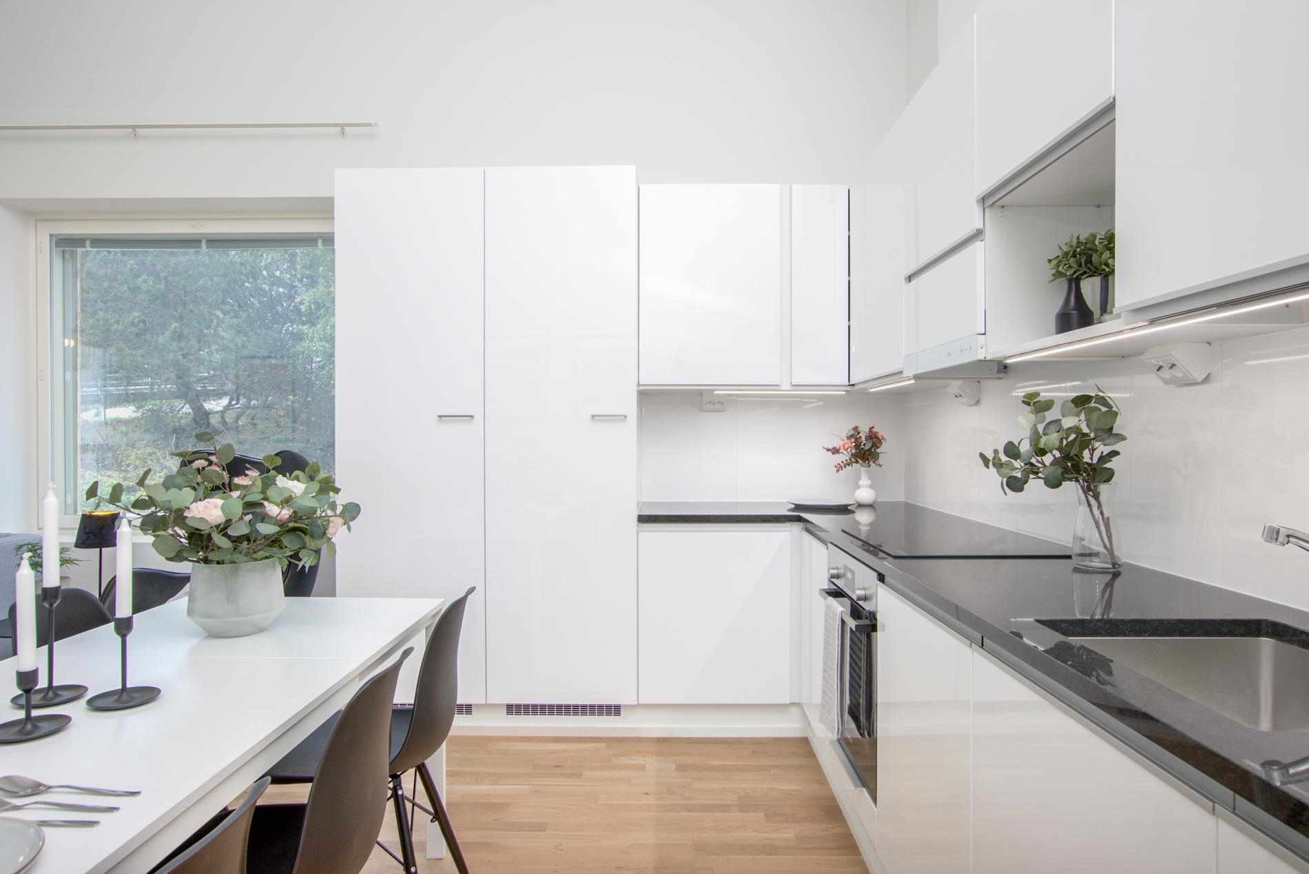 Yhtenäinen keittiö-olohuonetila tekee kodista ilmavan ja kutsuvan. Keittiö on varusteltu laadukkailla integroiduilla kodinkoneilla, vaaleilla sävyillä sekä kivitasoilla, jotka tuovat ripauksen luksusta ja kestävyyttä arkeen. Lasitettu parveke tarjoaa erinomaisen lisätilan kesäpäivien oleskeluun.