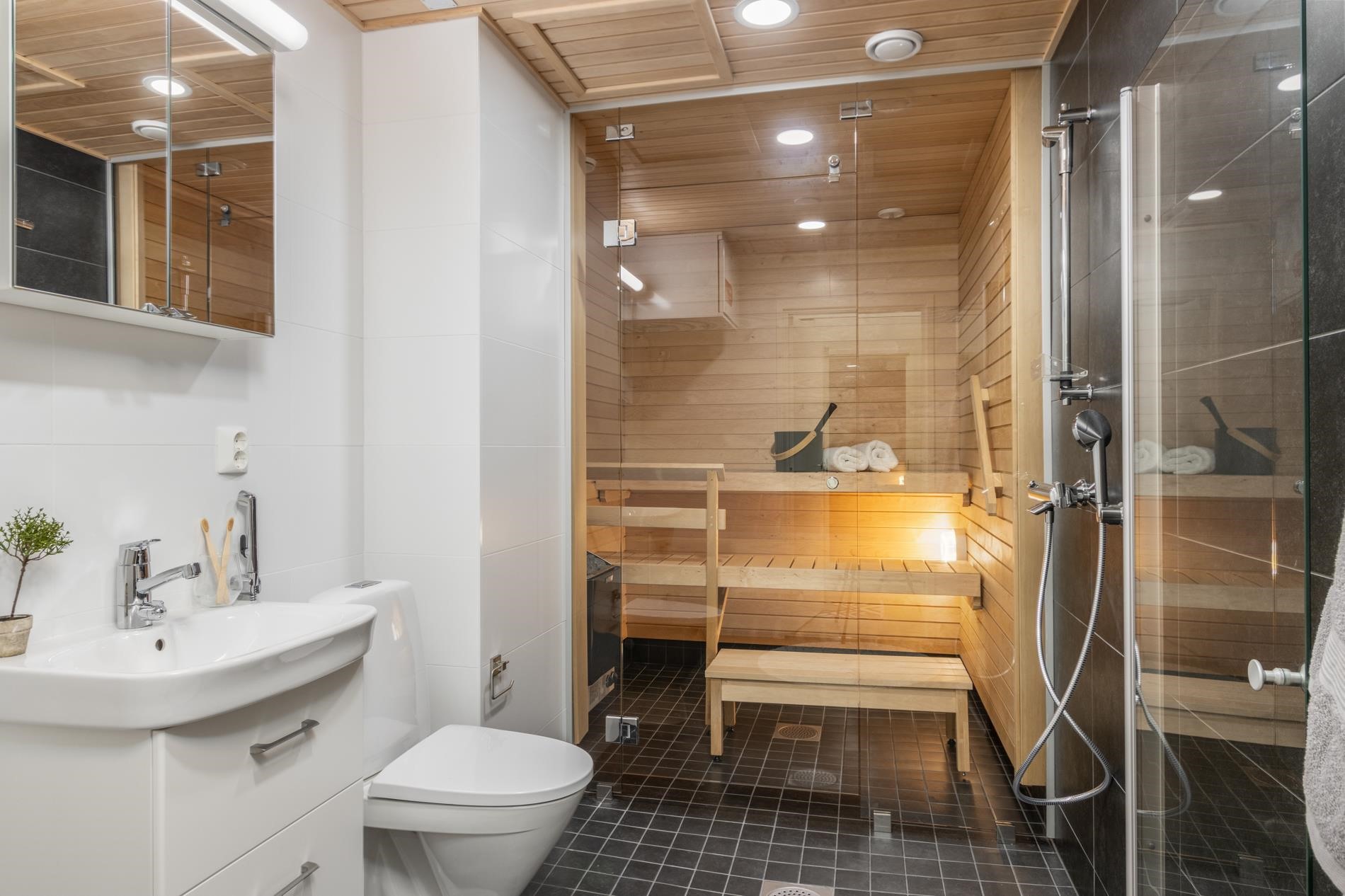 - Sauna, sähkökiuas, kylpyhuone, suihku, suihkuseinä, peilit, kaapit, allaskaappi, pesukoneliitäntä, lattialämmitys, kiinteät valaisimet.
