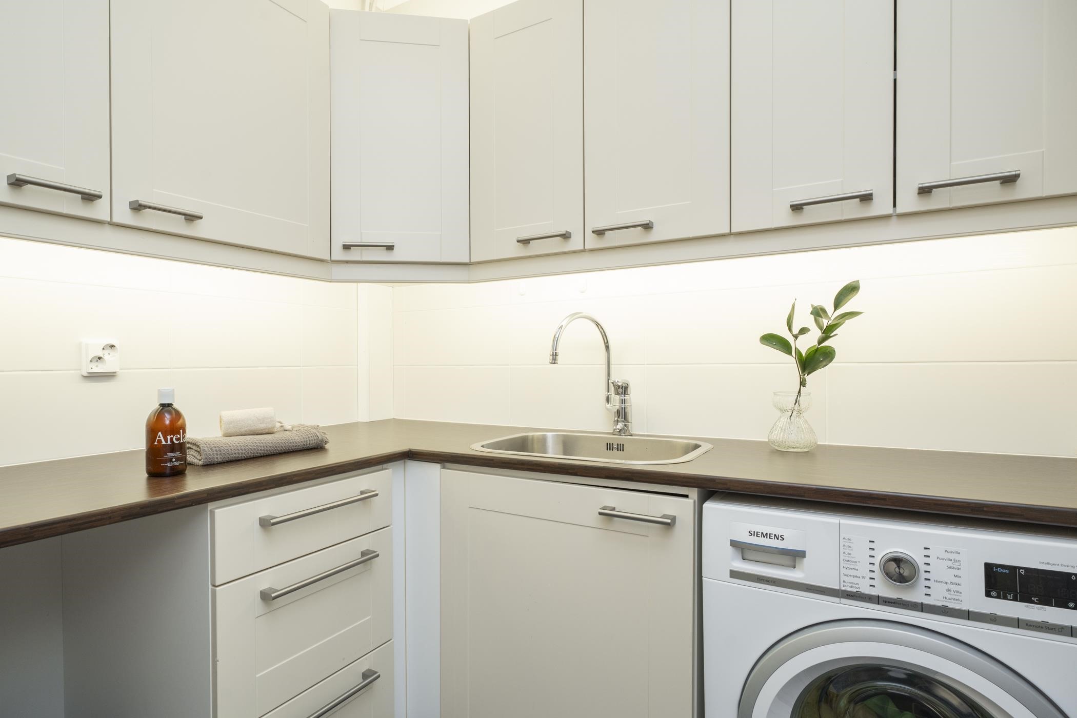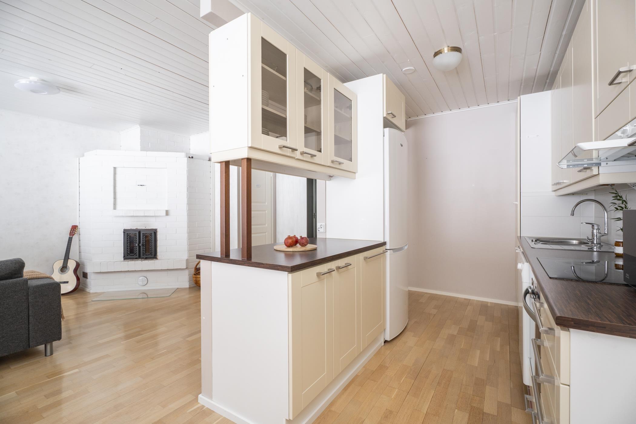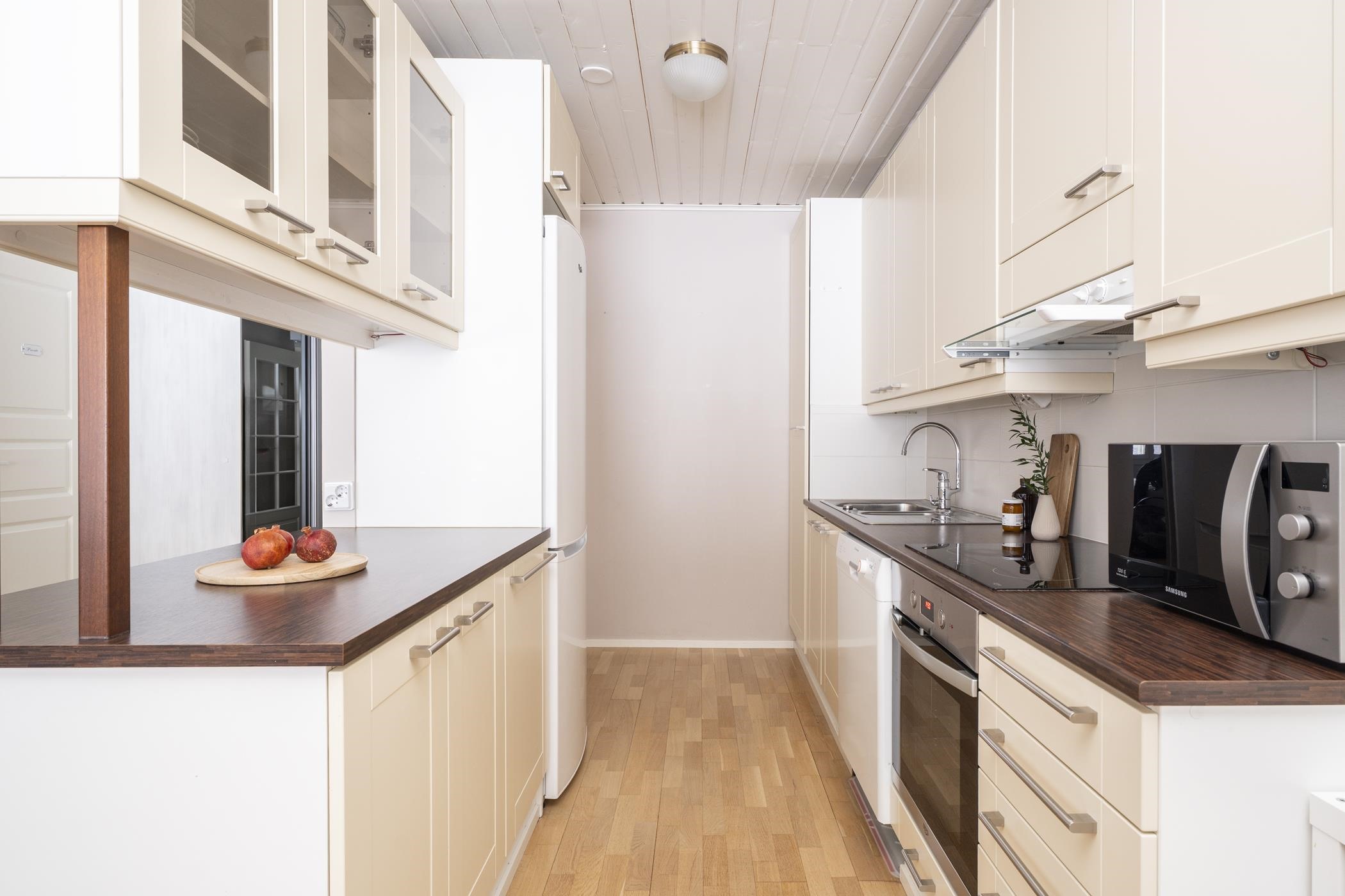 - Jääkaappipakastin, kiertoilmauuni erillisuuni, induktioliesitaso, liesituuletin huippuimuri, astianpesukone, kaapistot, kiinteät valaisimet.