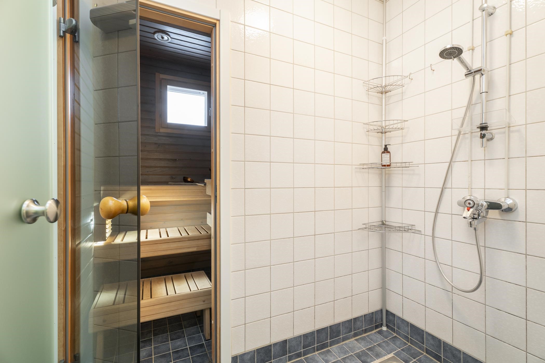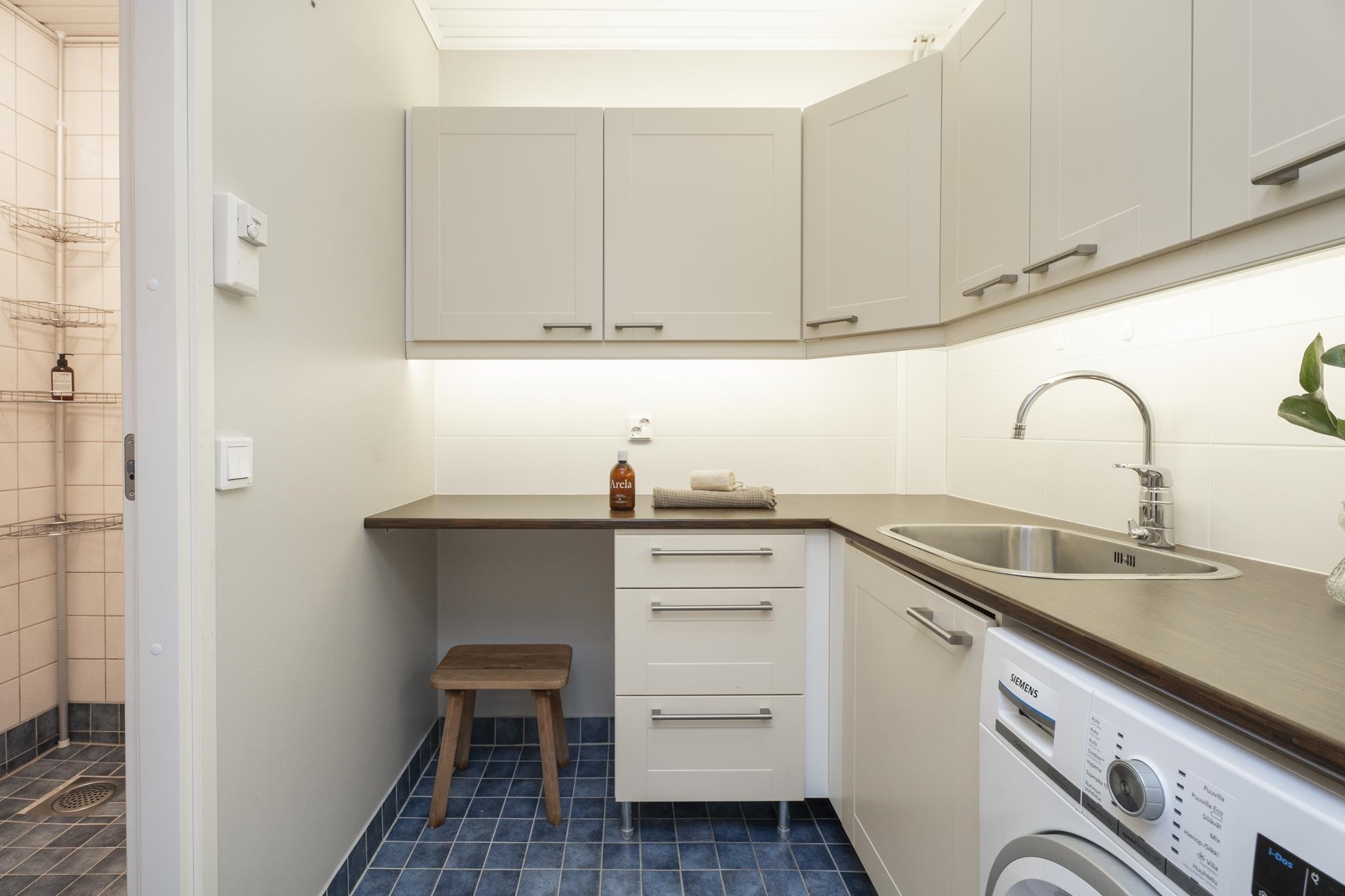 - Saunassa sähkökiuas. Kylpyhuoneessa suihku,lattialämmitys. Erllinen wc: peilit, kaapit, allaskaappi. Kodinhoitohuoneessa pesukoneliitäntä, lattialämmitys.