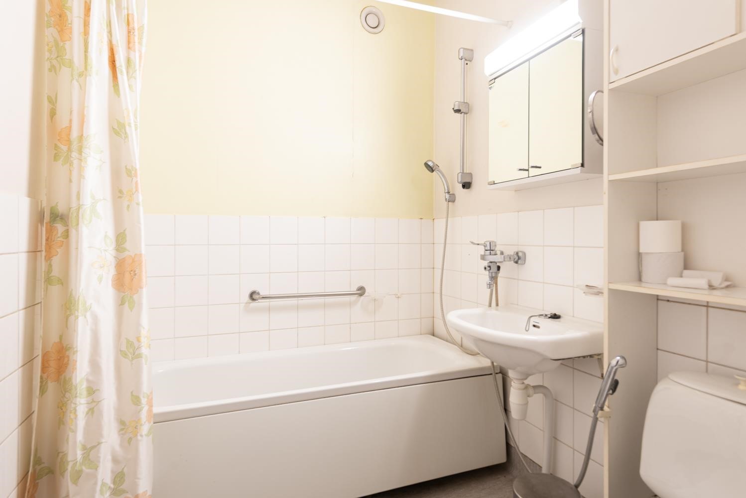 - Kylpyhuone, suihku, amme, peilikaappi, pesukoneliitäntä.