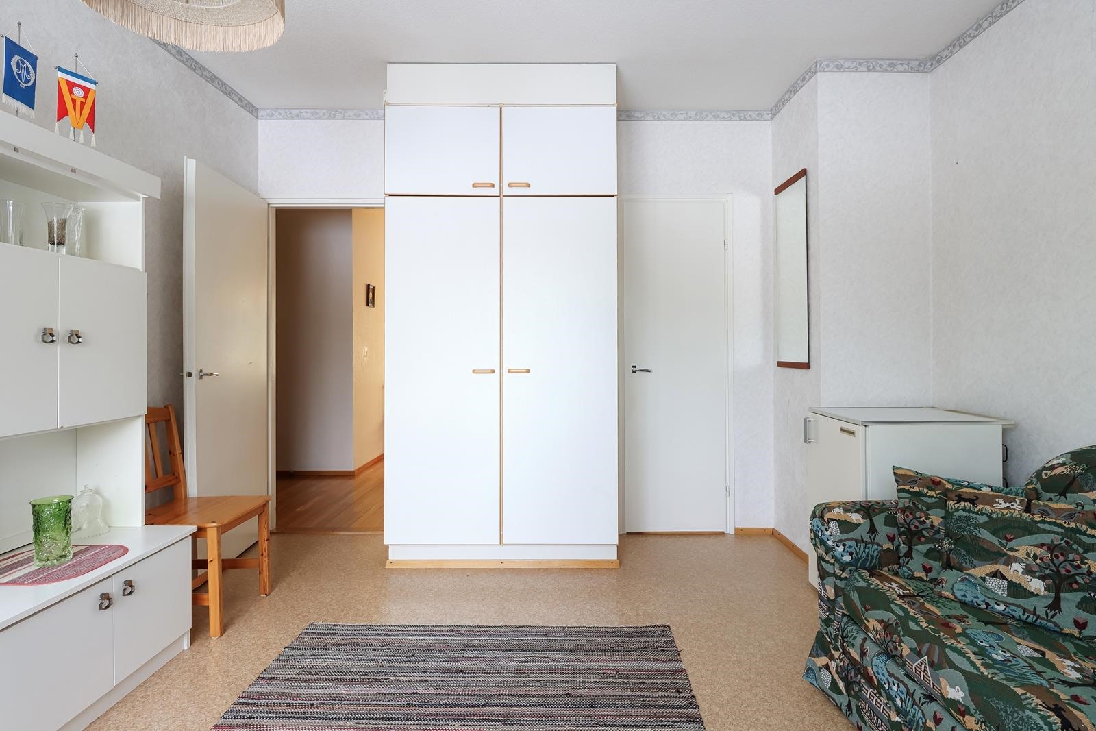 Keittiö: muovimatto. Olohuone: parketti. Makuuhuone 1: muovimatto. Makuuhuone 2: muovimatto. Sauna: laatta/paneeli. Kylpyhuone: laatoitettu. Eteinen: parketti. Wc: muovimatto.