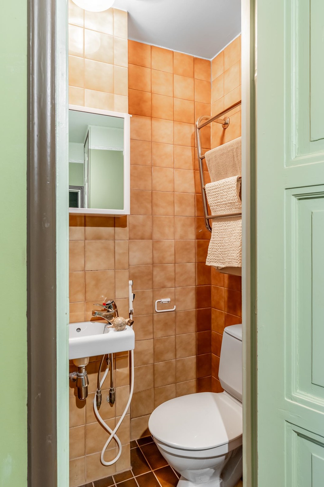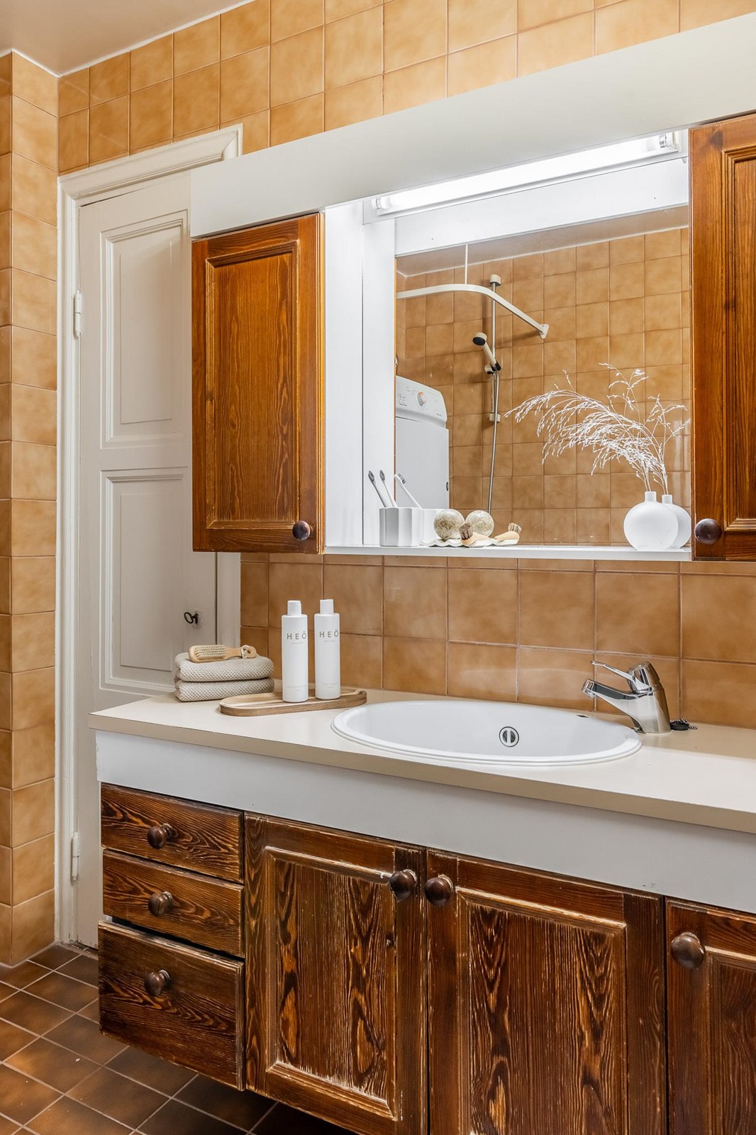 - Kylpyhuone, erillinen wc, suihku, peilikaappi, kaapit, allaskaappi, pesukoneliitäntä, kiinteät valaisimet.