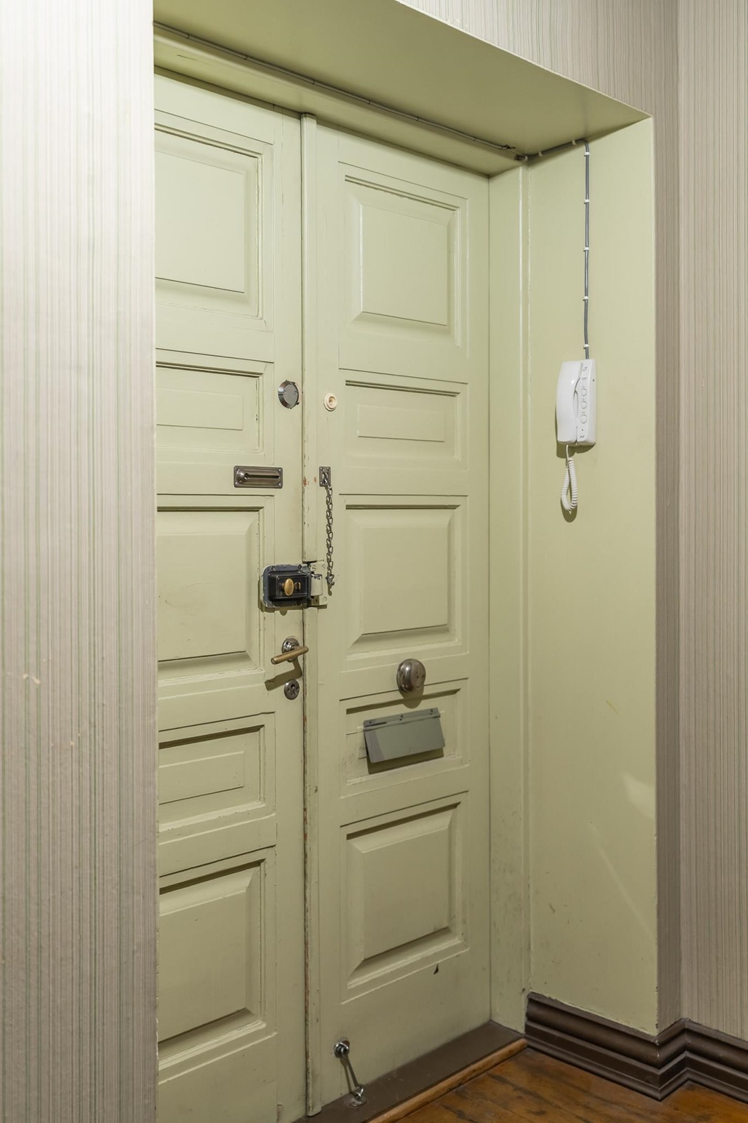 Huoneisto sijaitsee hissitalon neljännessä kerroksessa ja se on muodostettu kahdesta asunnosta, sisäänkäyntejä huoneistoon on peräti kolme, mikä mahdollistaa esimerkiksi työ- ja yksityiselämän erottamisen. Asunnosta löytyy kolme makuuhuonetta, tilava olohuone, ruokailuhuone, eteishalli, erillinen keittiö, vaatehuone sekä runsaasti kaappeja. Lisäksi varasto yhtiön kellaritiloissa.