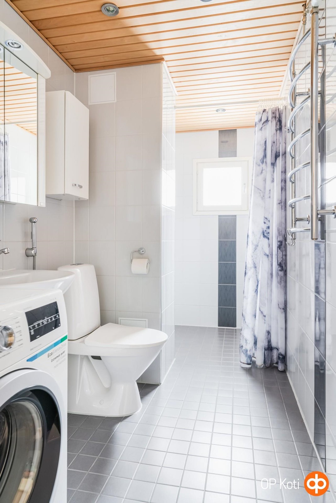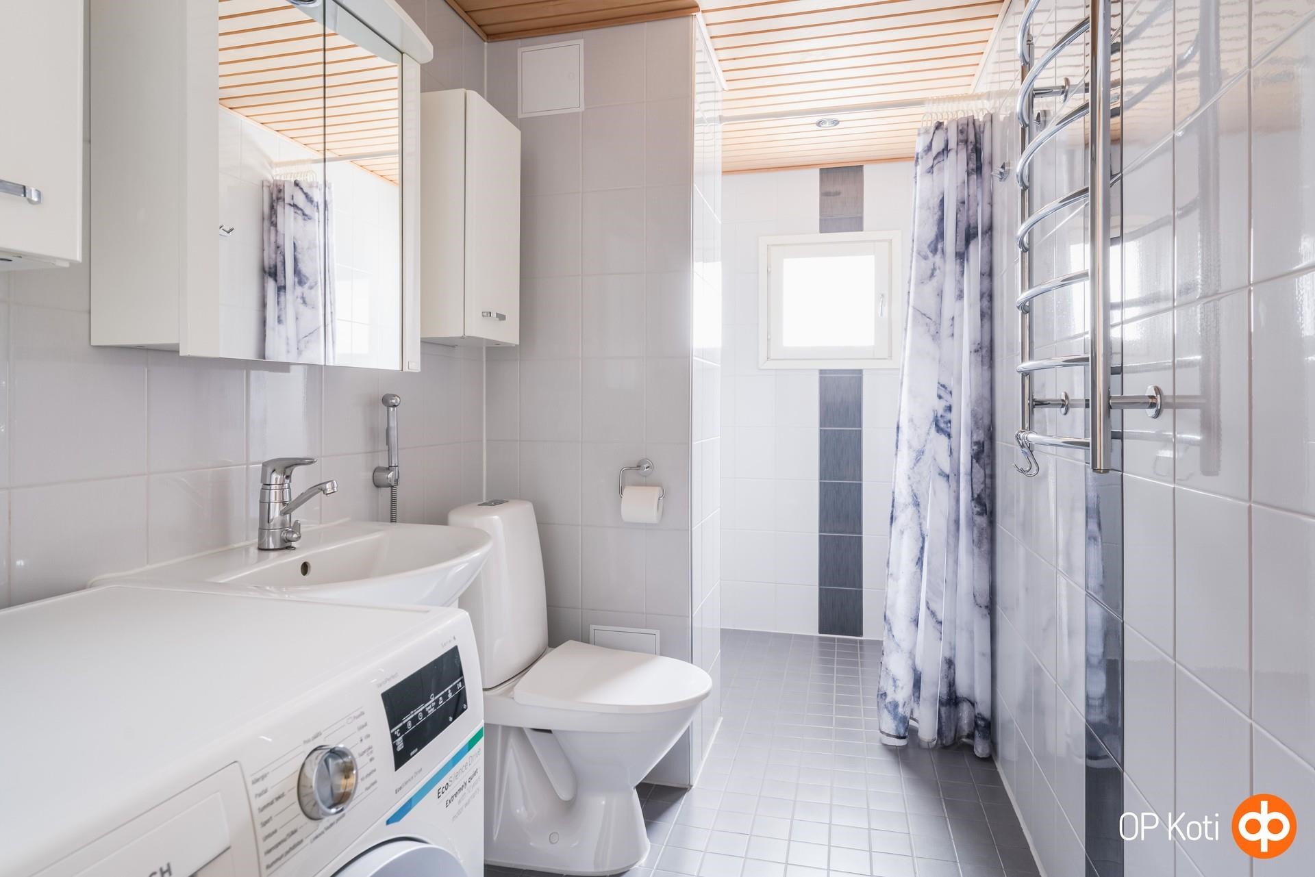 - Kylpyhuone (peilikaappi, allas, allaskaappi, seinäkaappi x 2kpl, wc-istuin, suihku), sähkötoiminen mukavuuslattialämmitys, kiinteät valaisimet. Kylpyhuone on uusittu kokonaan remontin yhteydessä. Samoin kaikki kalusteet. Pyyhekuivain on vesikiertoinen. Kylpyhuoneessa ikkuna.