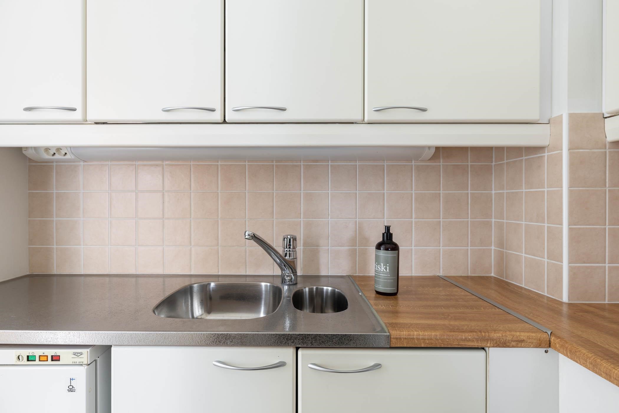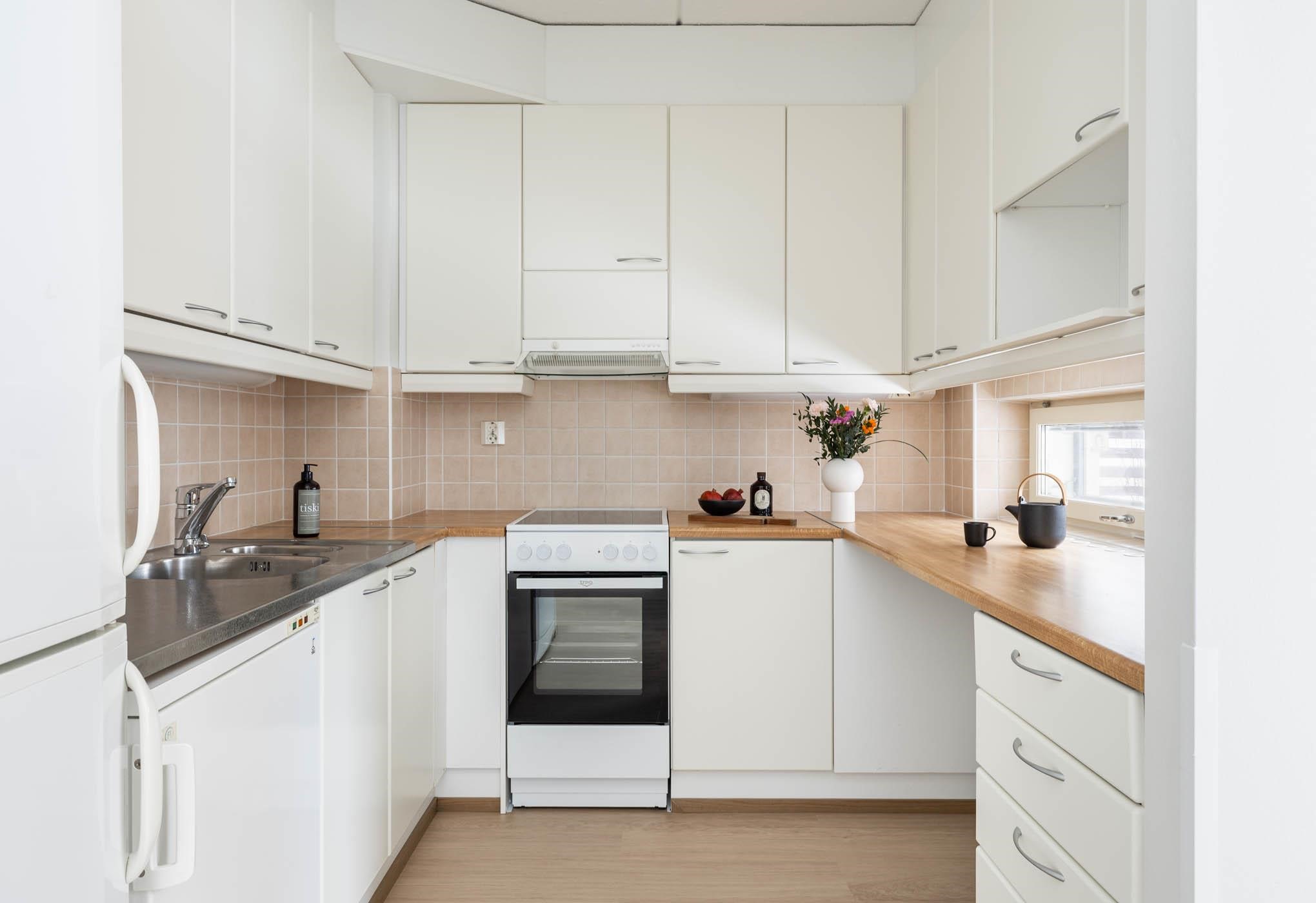 - Keittiön varusteisiin kuuluu jääviileäkaappi, pakastekaappi, keraaminen liesi, liesituuletin, kaapistot ja kiinteät valaisimet.