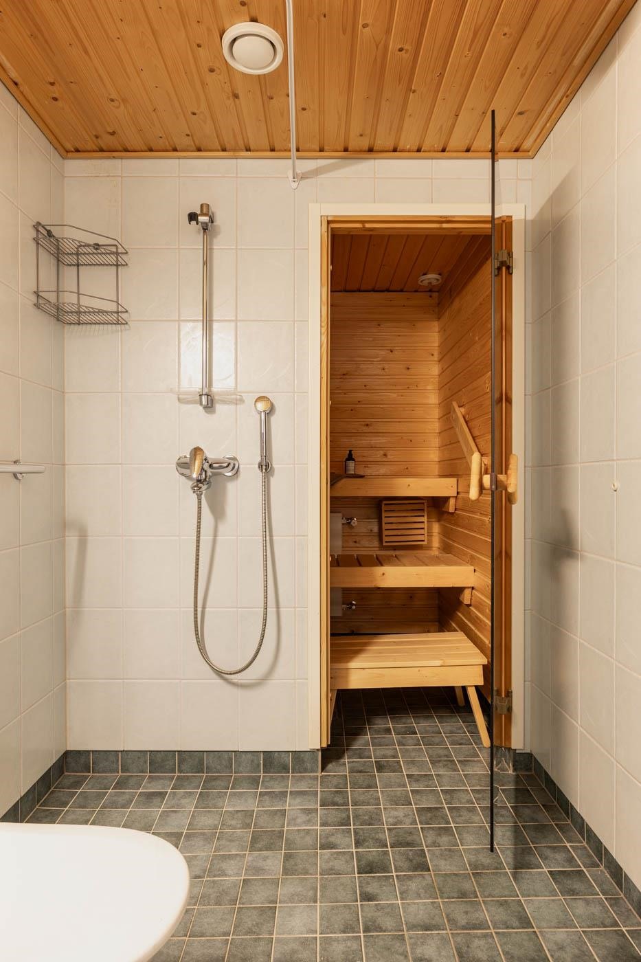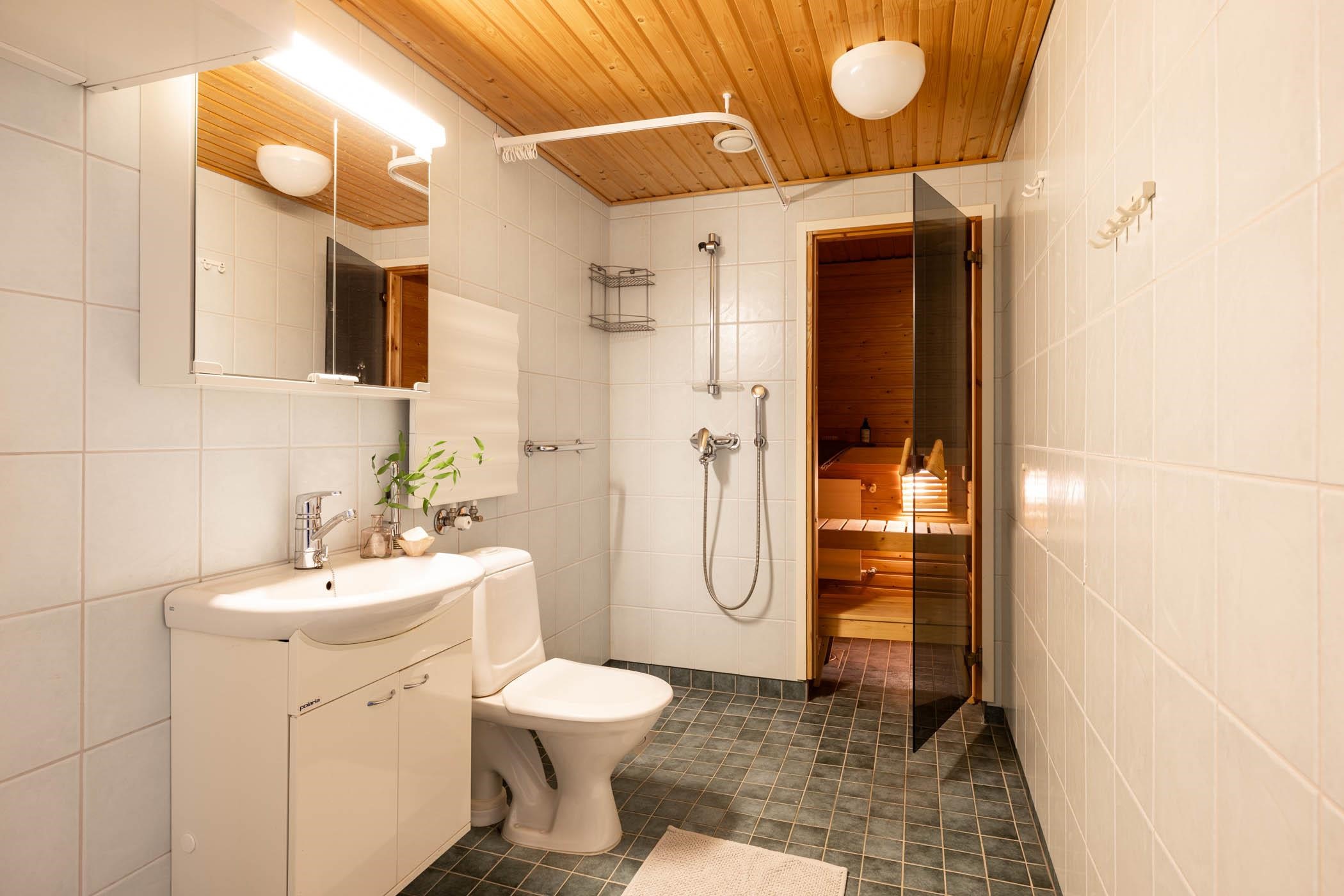 - Saunassa on sähkökiuas. Kylpyhuoneessa on suihku, (suihkuseinä varastossa tallessa), peilikaappi, allaskaappi, pesukoneliitäntä sekä kiinteät valaisimet.