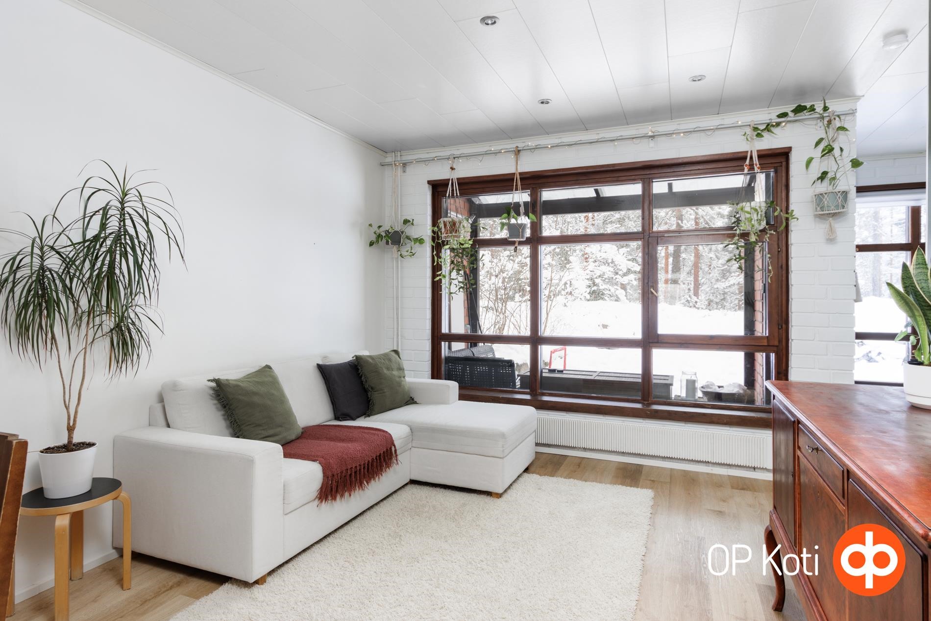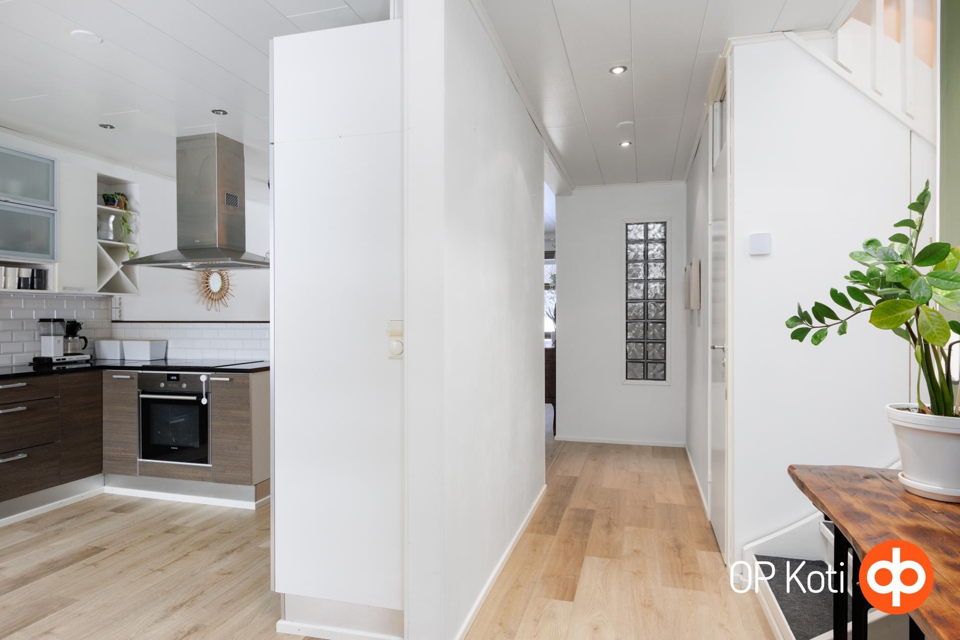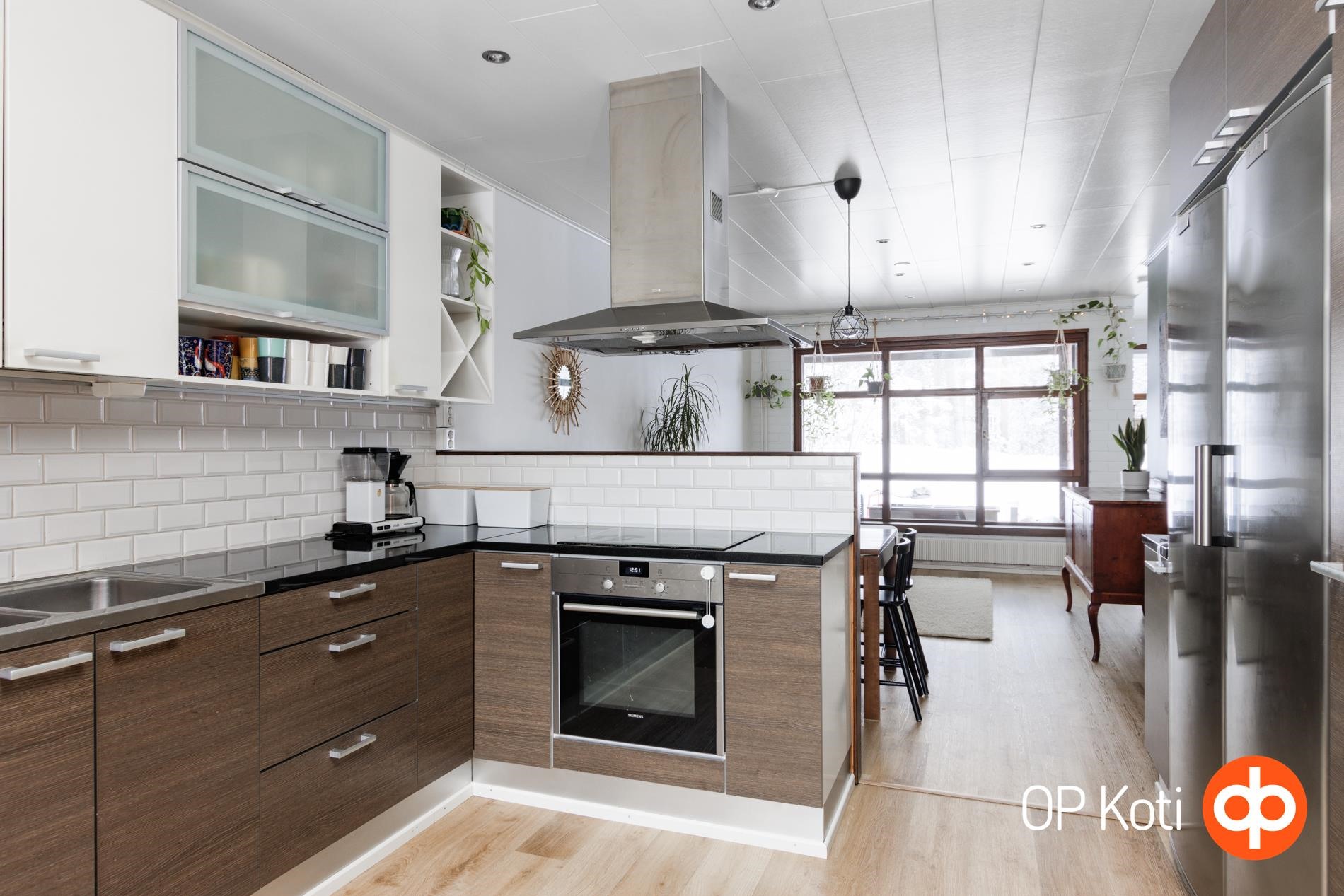 Tilavat ja valoisat huoneet valoa pursuavine ikkunoineen tarjoavat loistavan pohjan asumiselle. Huoneisto on kahdessa tasossa, joten jokaiselle löytyy oma paikkansa ja omaa rauhaa mielin määrin. Päätyasunto sijaitsee luonnonhelmassa, josta avautuvat upeat metsäiset maisemat ympäröivään luontoon. Etenkin lapsi- ja lemmikkiperheille mahtava sijainti: takapihalta alkaa metsäpalsta ja lähellä niin uimaranta kuin lenkkipolut Puijoa unohtamatta.
