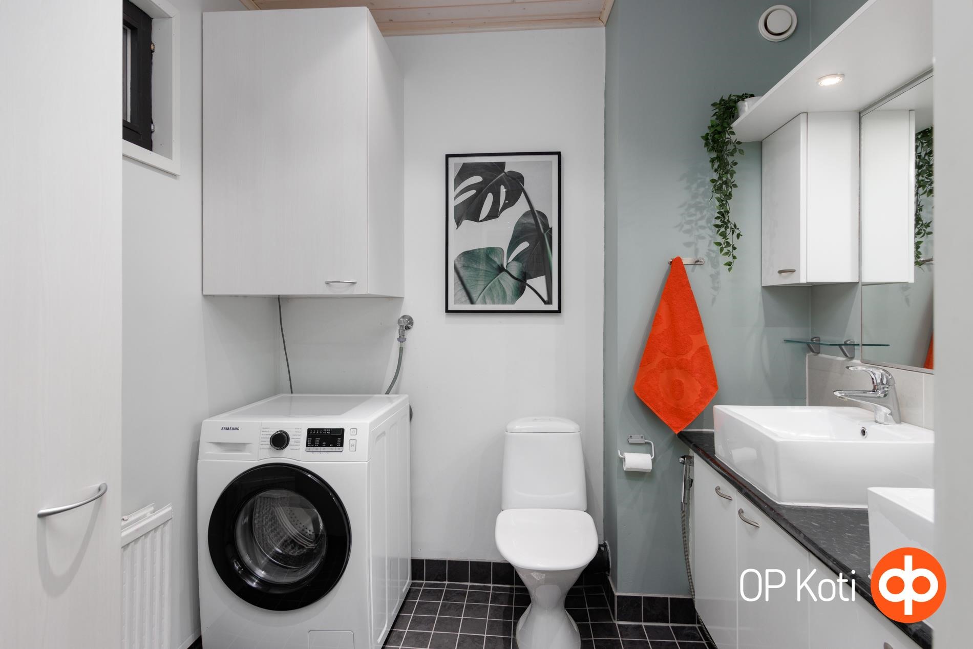 - Sauna, sähkökiuas, kylpyhuone, erillinen wc, suihku x 2, peilit, kaapit, allaskaappi, pesukoneliitäntä, lattialämmitys, kiinteät valaisimet.