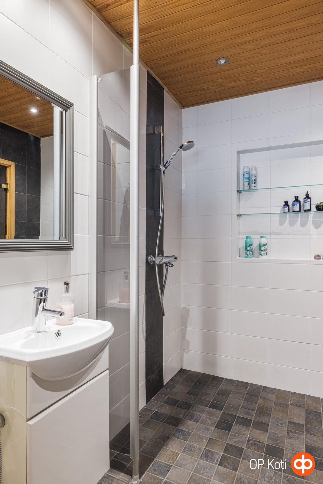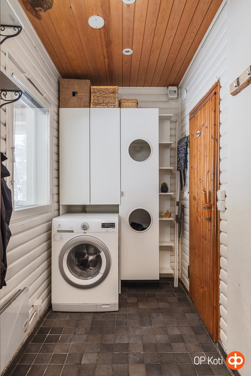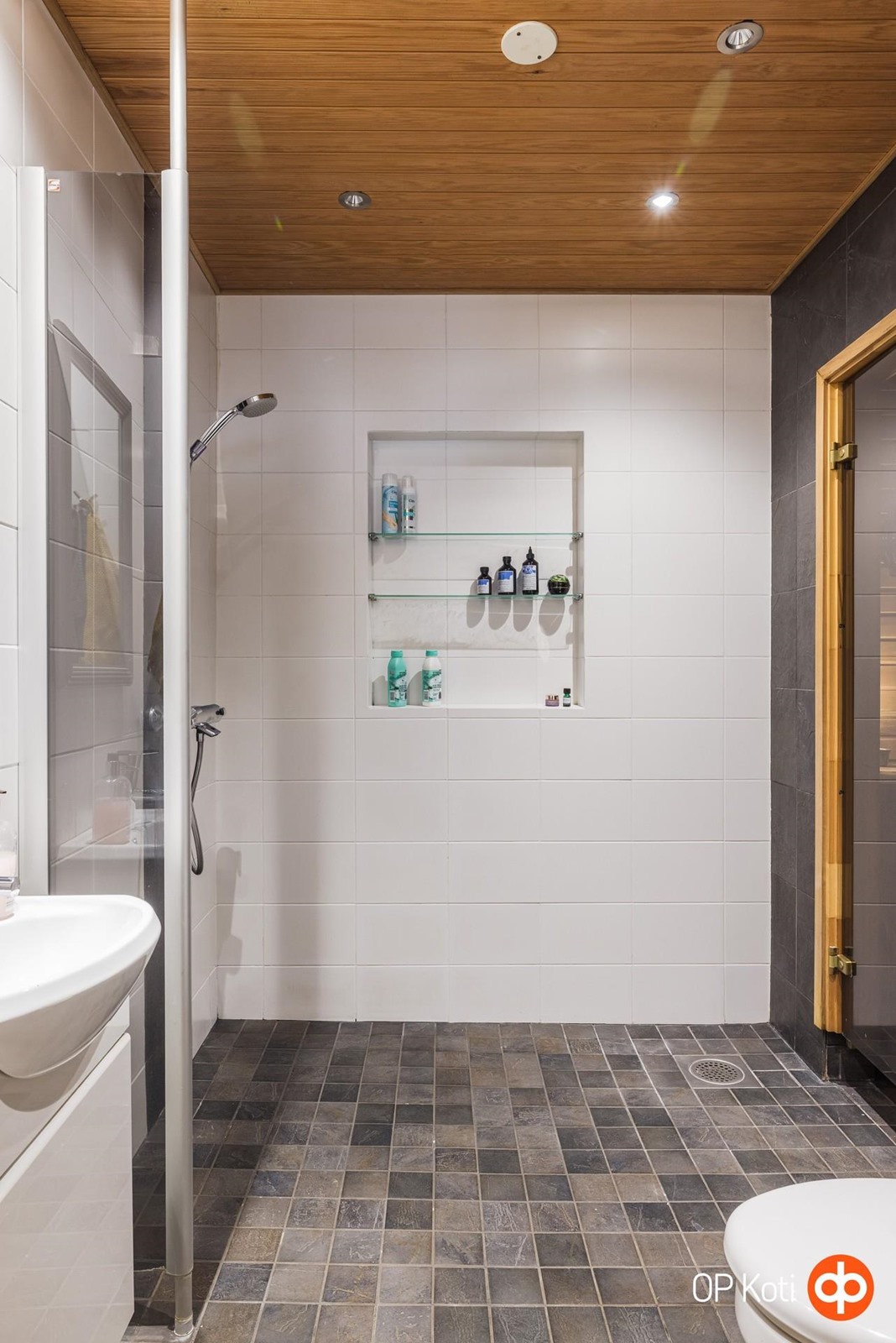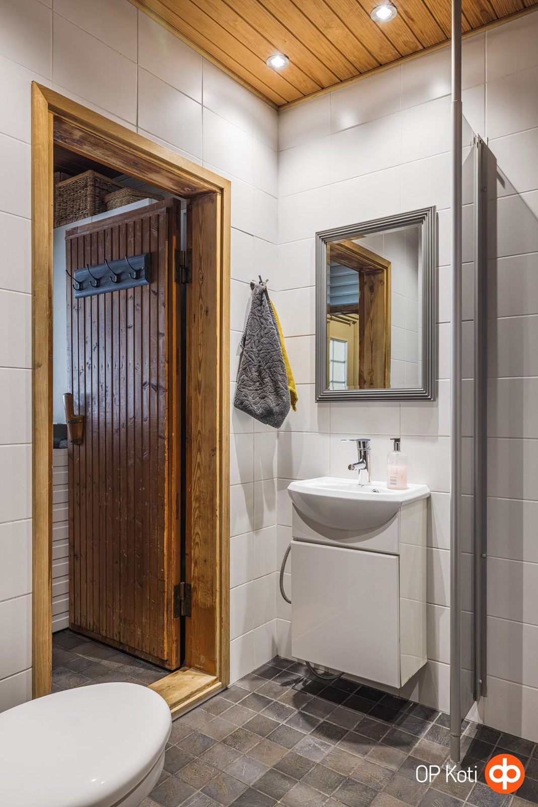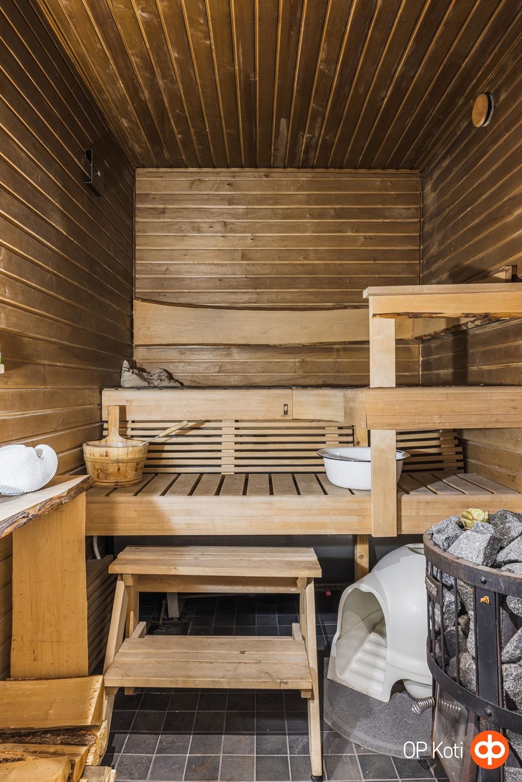 - Sauna, puukiuas, kylpyhuone, erillinen wc, suihku, suihkuseinä, peilit, allaskaappi, pesukoneliitäntä pukuhuoneessa, lattialämmitys, kiinteät valaisimet.