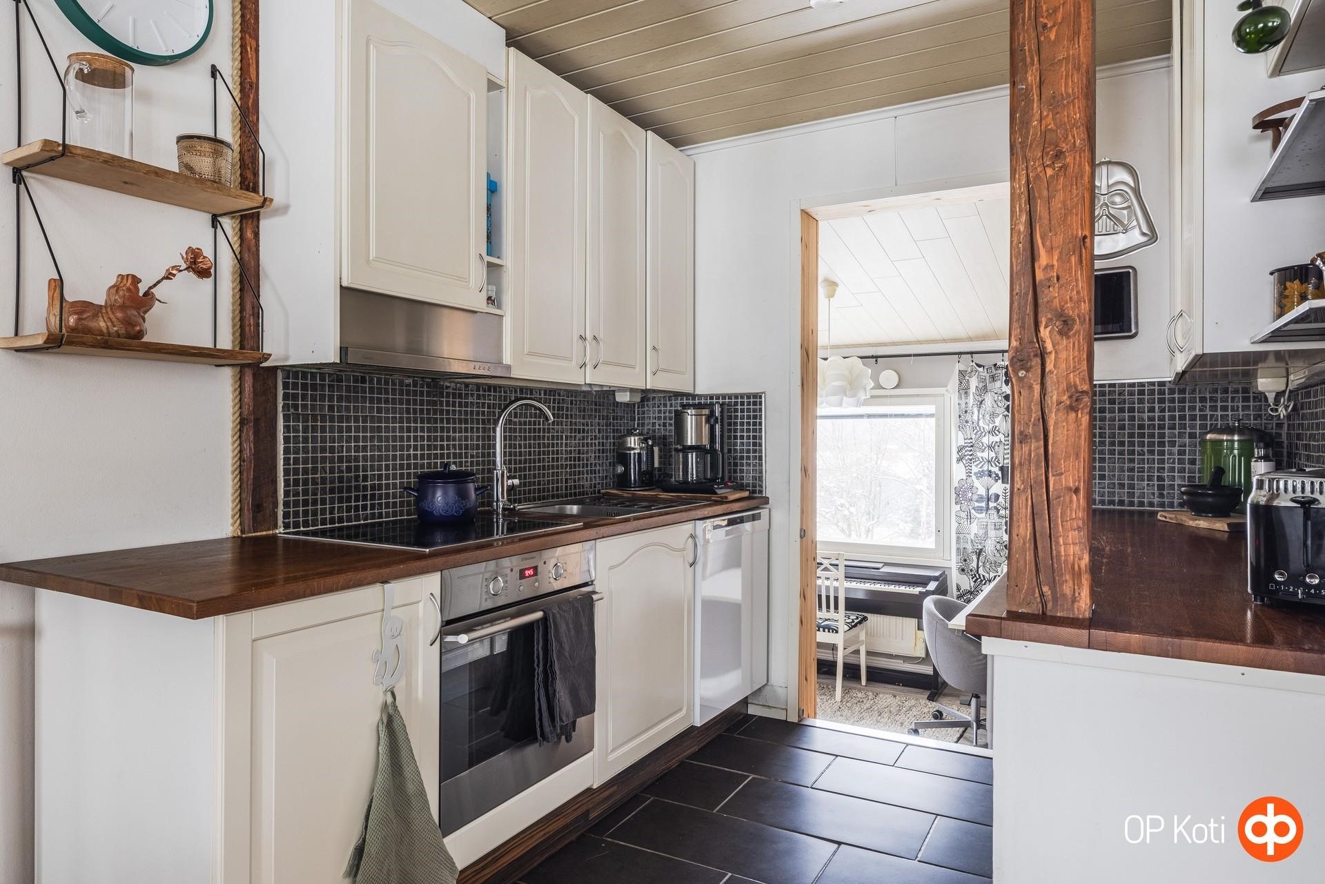 - Jääkaappipakastin v. 2025, erillisuuni, keraaminen liesi, liesituuletin hormiin, astianpesukone v. 2025, kaapistot, kiinteät valaisimet, pöytätasojen materiaali puu.