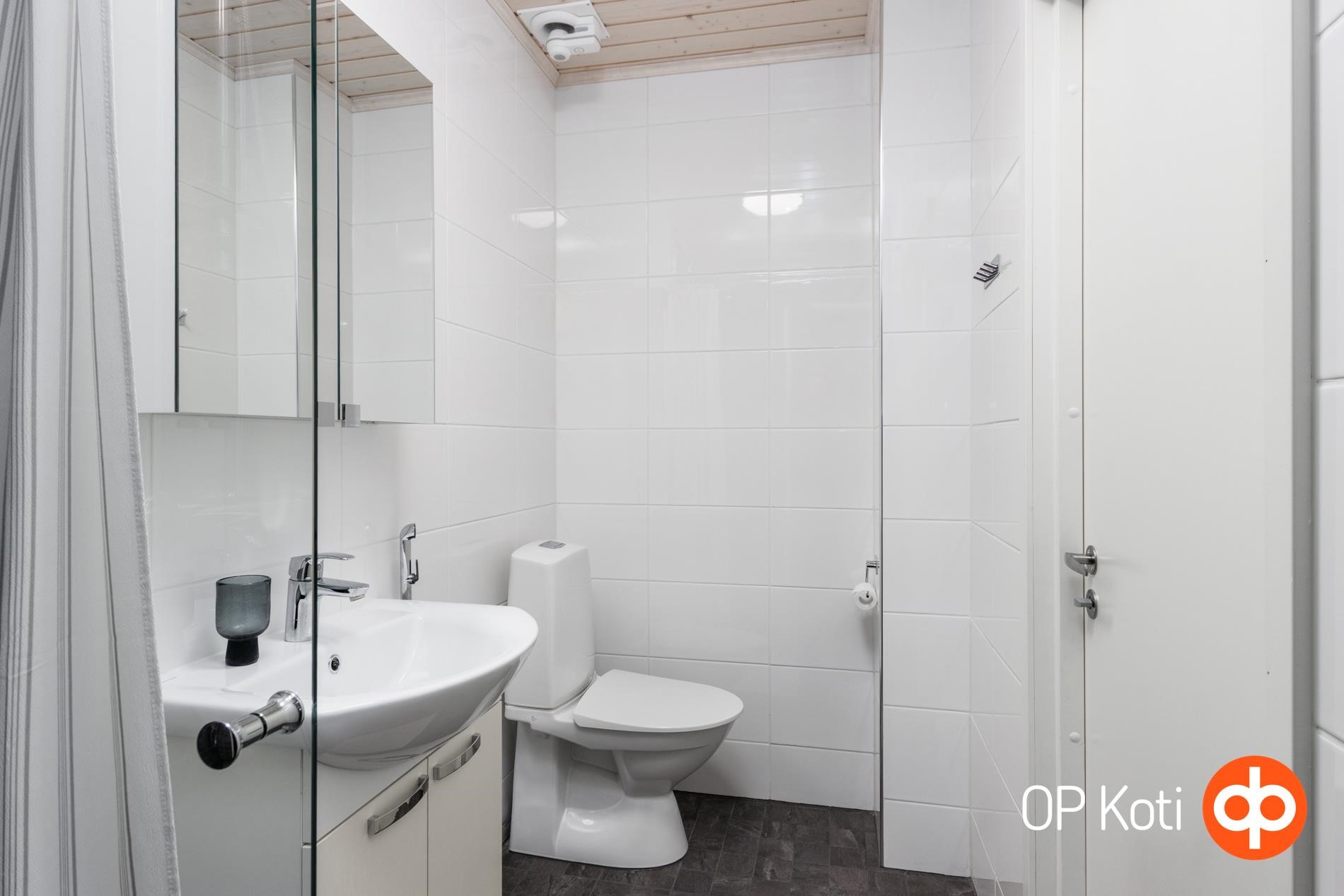 - Sauna, sähkökiuas, kylpyhuone myös wc-istuin, erillinen wc, suihku, suihkuseinä, peilikaappi, allaskaappi, pesukoneliitäntä, lattialämmitys sähköinen, kiinteät valaisimet. syksy 2022 kph/sauna uusittu alakerta wc kevät 2022 remontoitu
