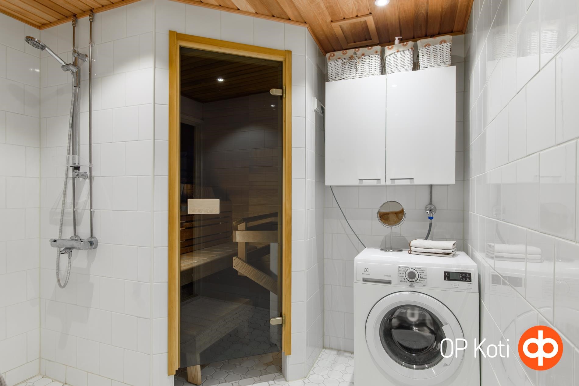 - Sauna, sähkökiuas, kylpyhuone, erillinen wc, suihku, peilit, kaapit, allaskaappi, pesukoneliitäntä, lattialämmitys, kiinteät valaisimet.