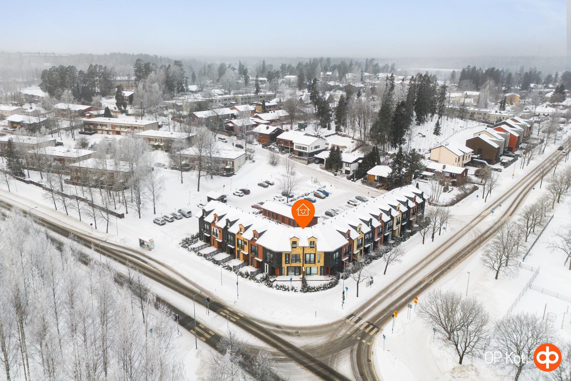 Lähimmät koulut ja päivkodit löytyvät 200metrin päästä. Sujuvat bussiyhteydet helpottavat liikkumista. Bussiin pääsee viereiseltä kadulta, josta yhteydet niin Helsinkiin kuin Vantaan suuntaan.
