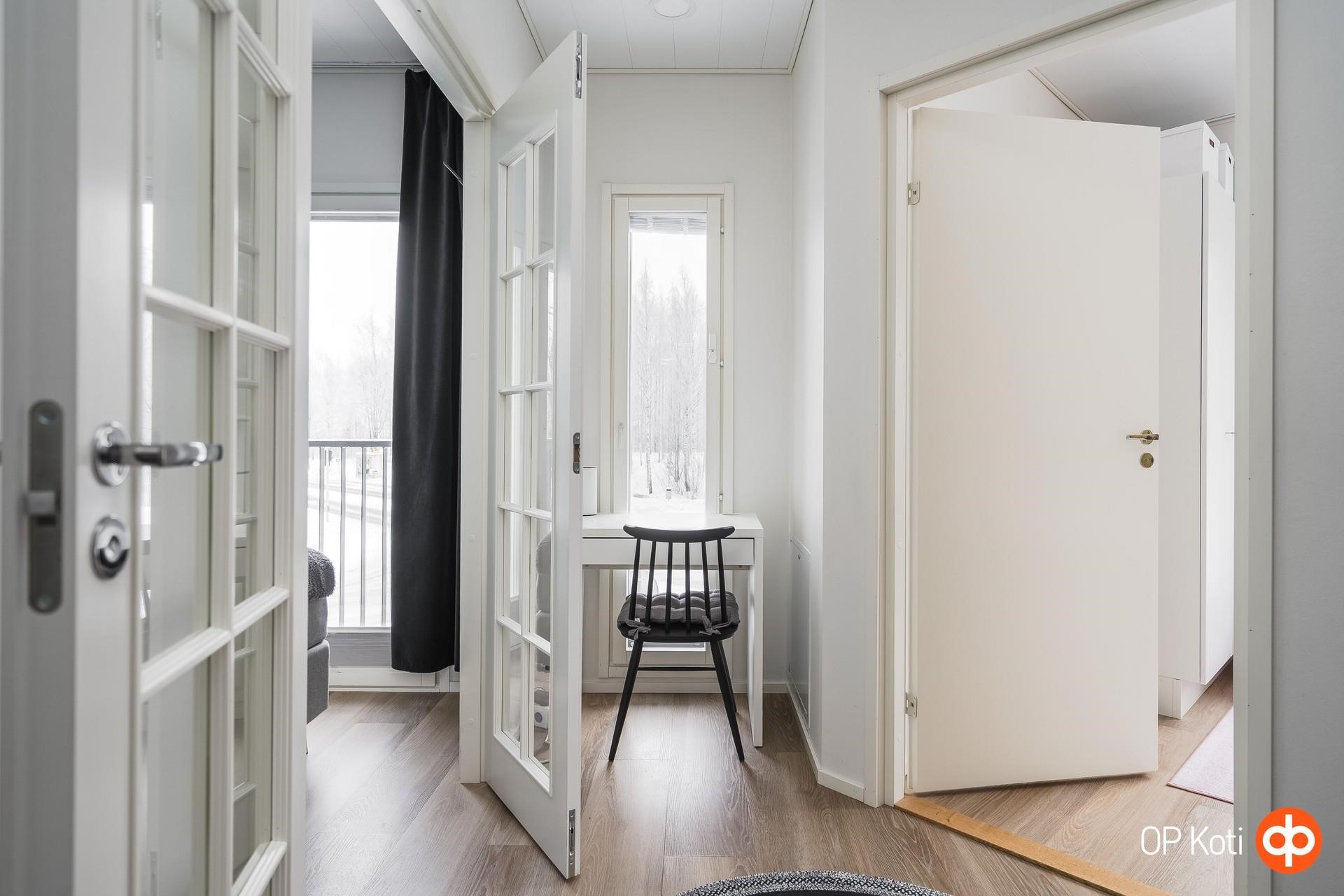 Ensimmäisessä kerroksessa sijaitsevat valoisa olohuone, keittiö sekä käytännöllinen kodinhoitotila ja wc. Olohuoneesta ja keittiöstä on käynti lasitetulle, suojaisalle terassille, josta näkymät vehreälle pihalle. Toisessa kerroksessa on kaksi makuuhuonetta, pieni työpiste sekä tunnelmalliset saunatilat ja kylpyhuone. Saunatilasta on käynti parvekkeelle, jossa on mukava vilvoitella makoisten löylyjen jälkeen. Ylin kerros tarjoaa avointa tilaa, joka soveltuu erinomaisesti makuuhuoneeksi, työtilaksi tai harrastetilaksi.