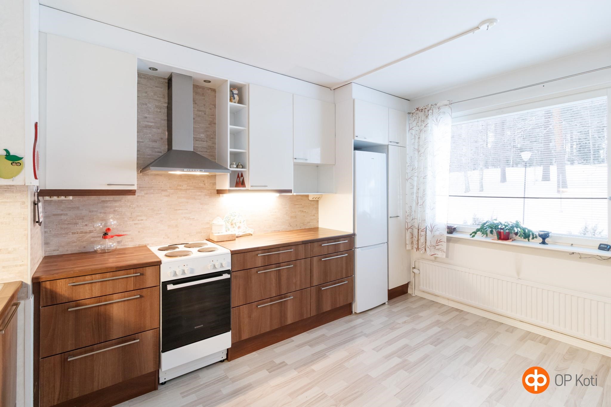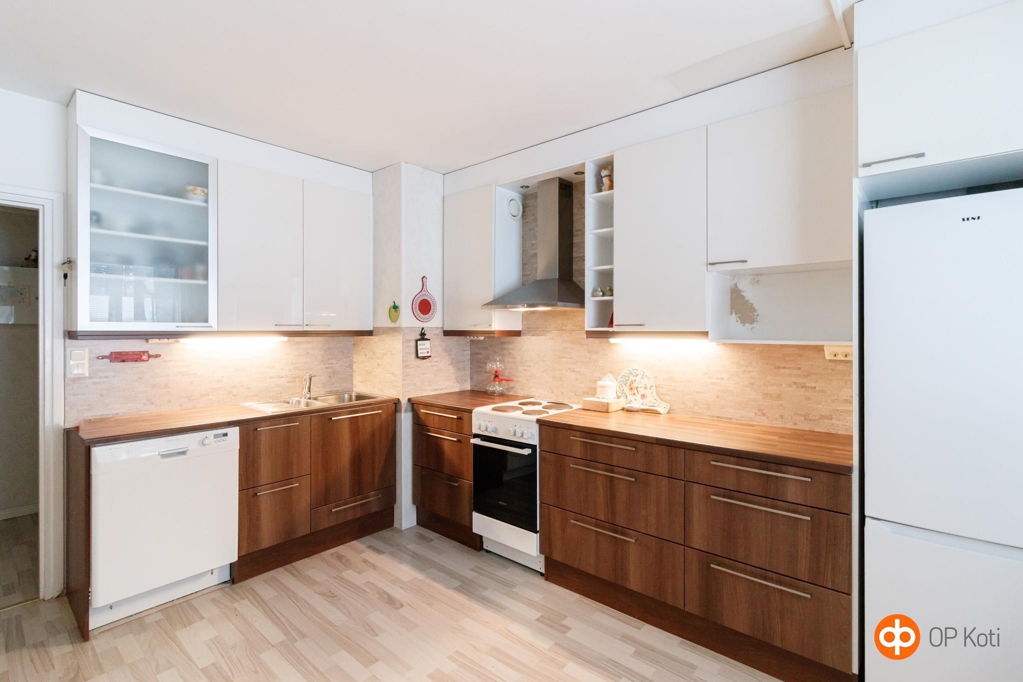 - Jääkaappipakastin, sähköliesi, liesituuletin, astianpesukone, kaapistot, kiinteät valaisimet.