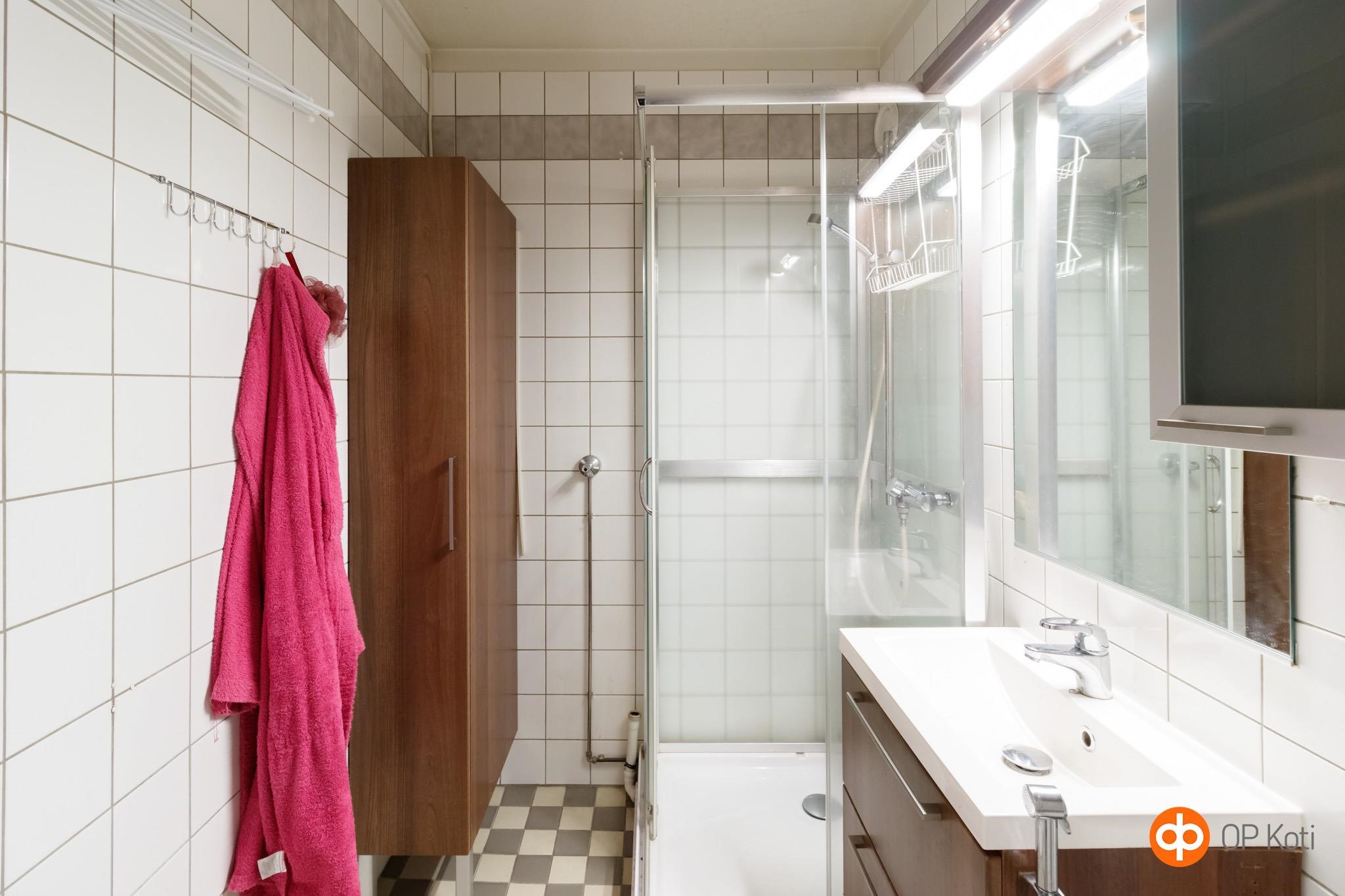 - Kylpyhuone, suihkukaappi ovi on viallinen, peilit, kaapit, allaskaappi, pesukoneliitäntä, kiinteät valaisimet.
