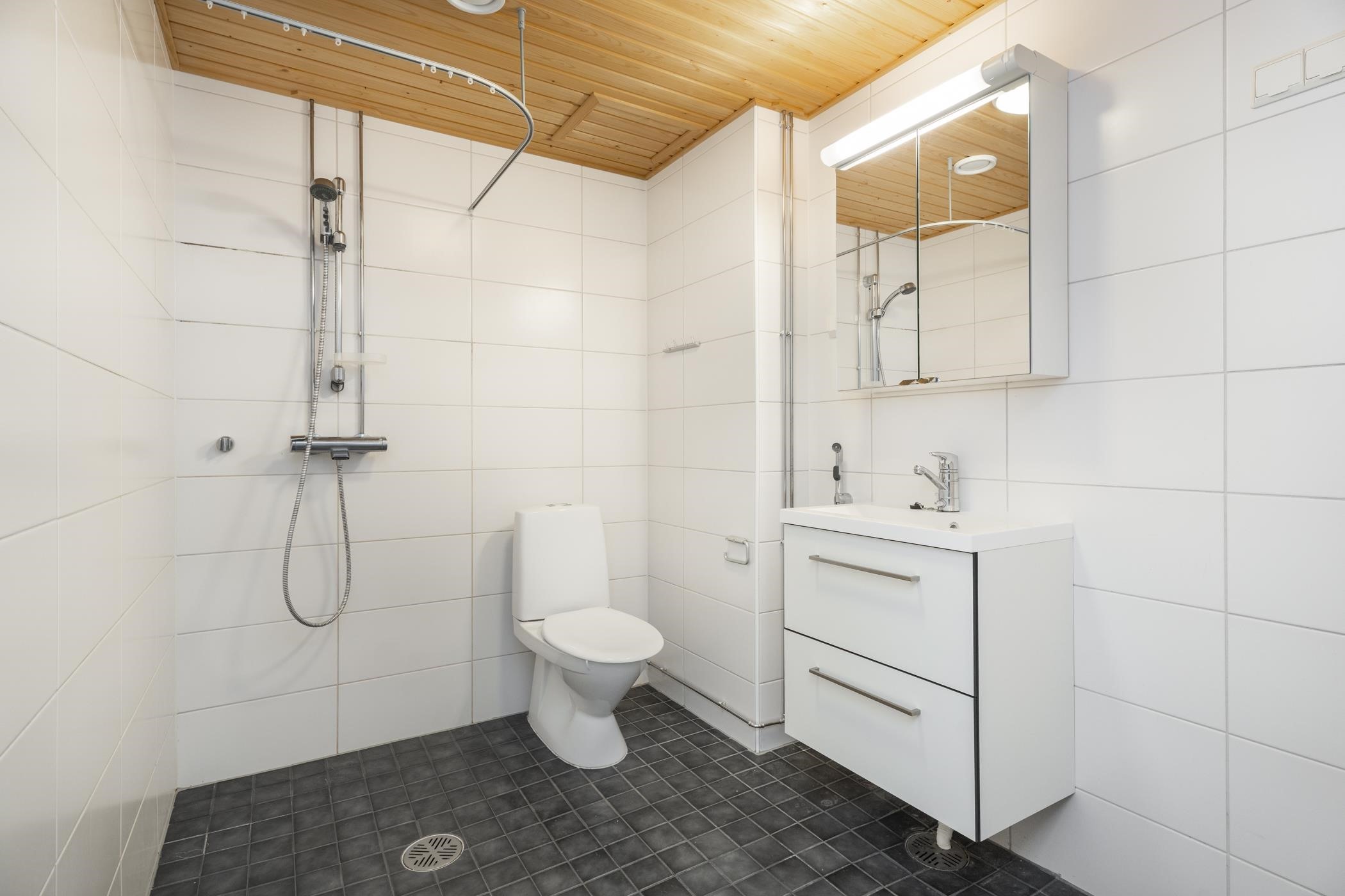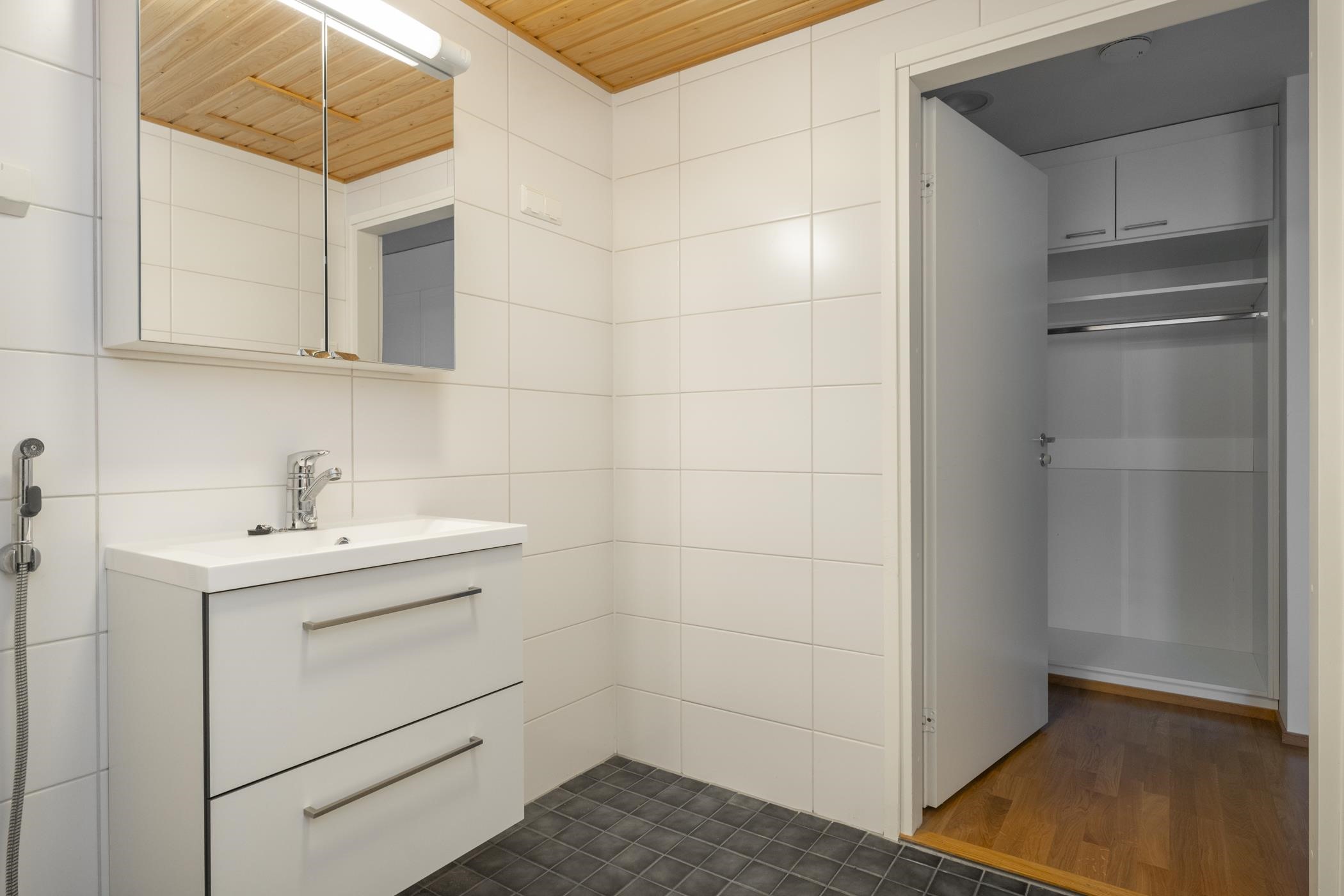 - Kylpyhuoneessa on suihku, peilikaappi, allaskaappi, pesukoneliitäntä, kiinteät valaisimet.