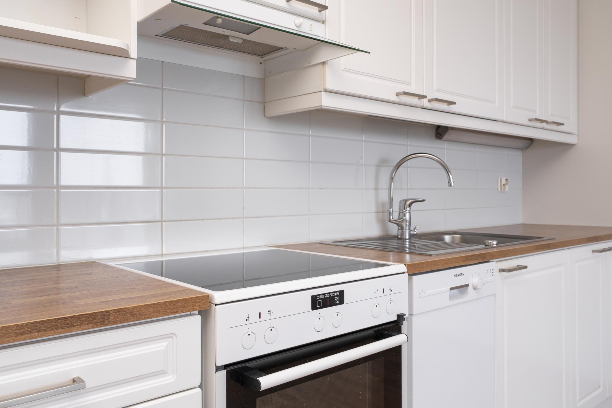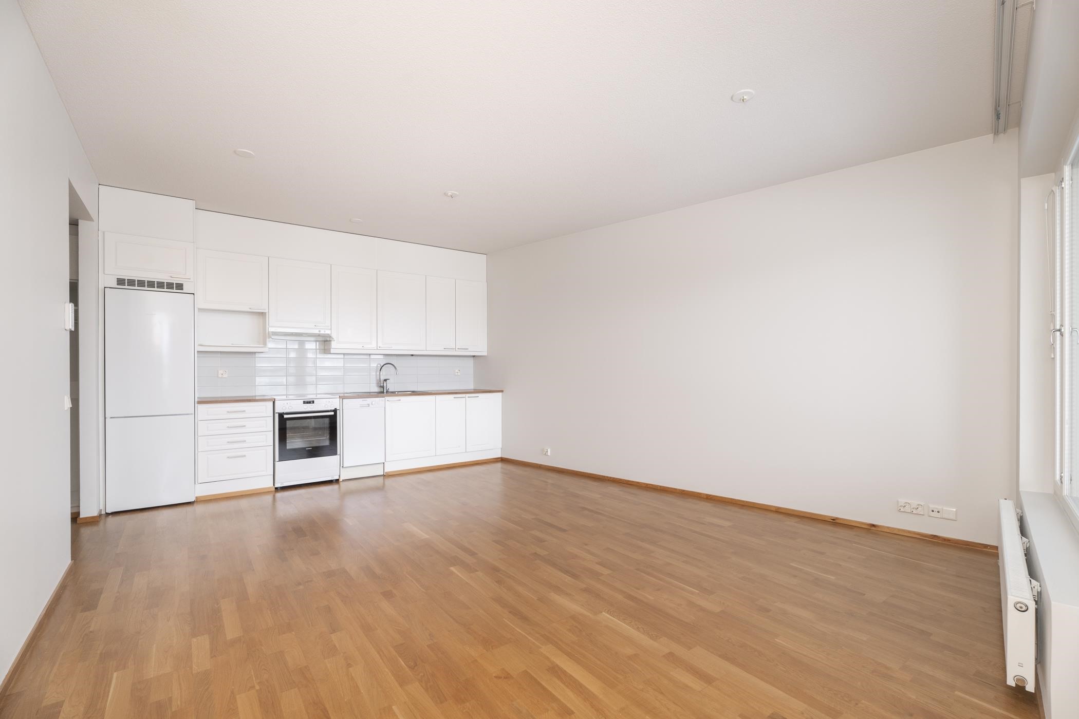 - Keittiön varusteluun kuuluu jääkaappipakastin, lattialiesi, liesituuletin, astianpesukone, kaapistot, kiinteät valaisimet.