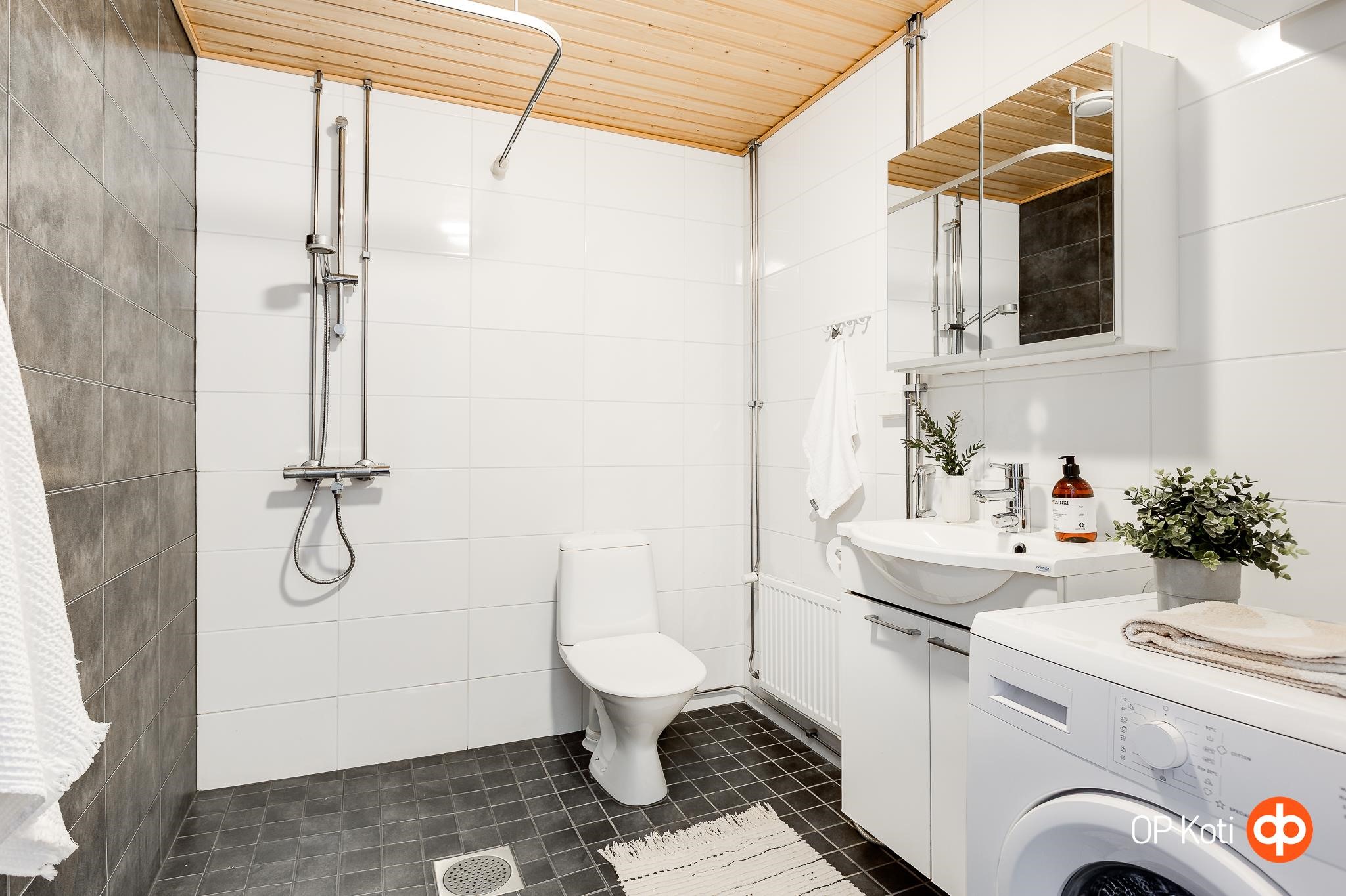 - Kylpyhuone, suihku, peilikaappi, allaskaappi, pesukoneliitäntä, lattialämmitys, kiinteät valaisimet. Kuivausrumpu mahtuu pyykinpesukoneen päälle