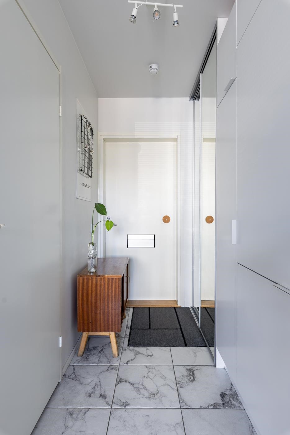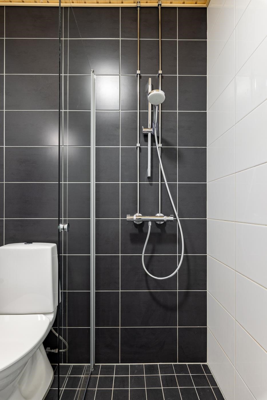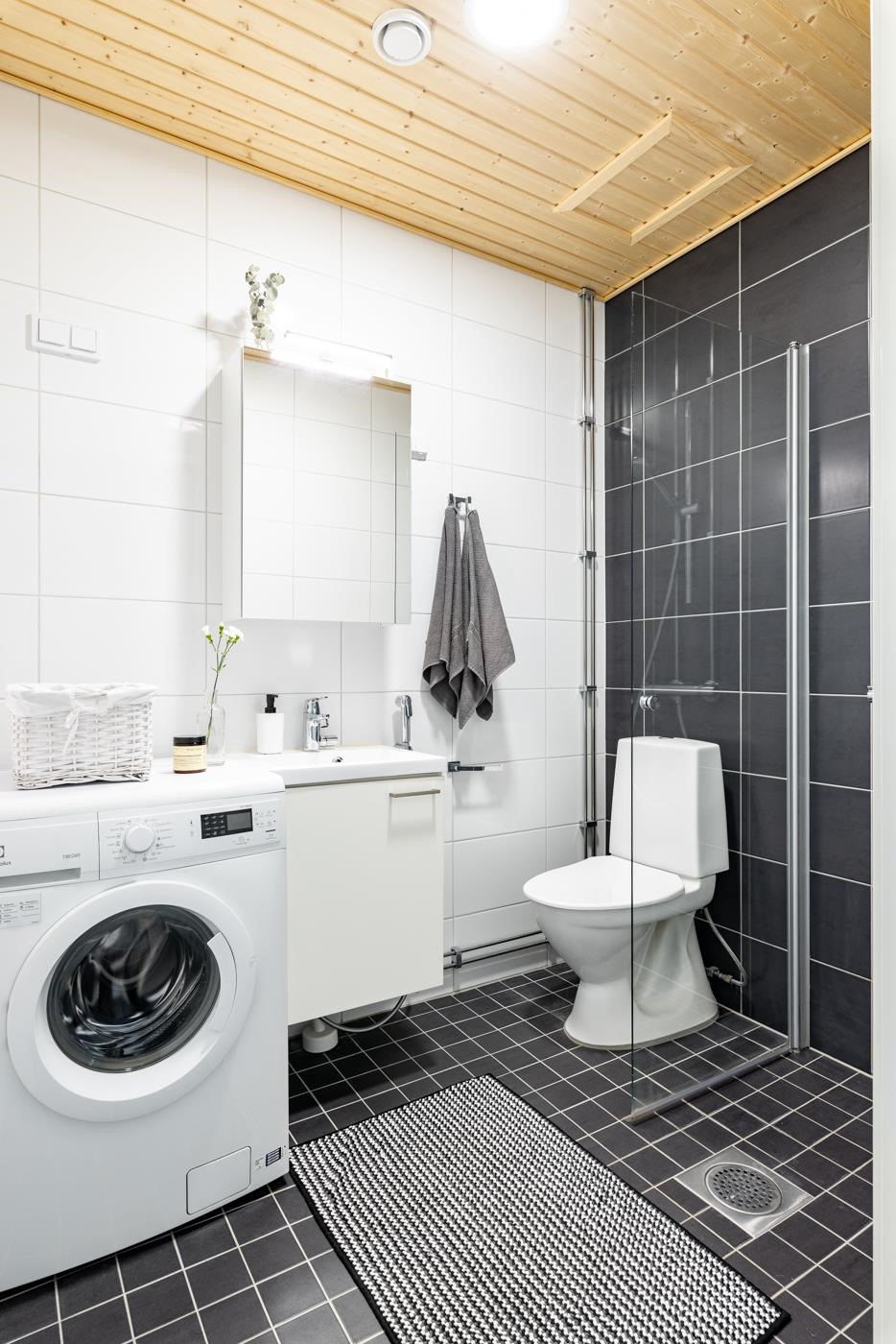 - Kylpyhuoneessa : WC, suihku ja suihkuseinä, peilikaappi, allaskaappi, pesukoneliitäntä, lattialämmitys ja kiinteät valaisimet.
