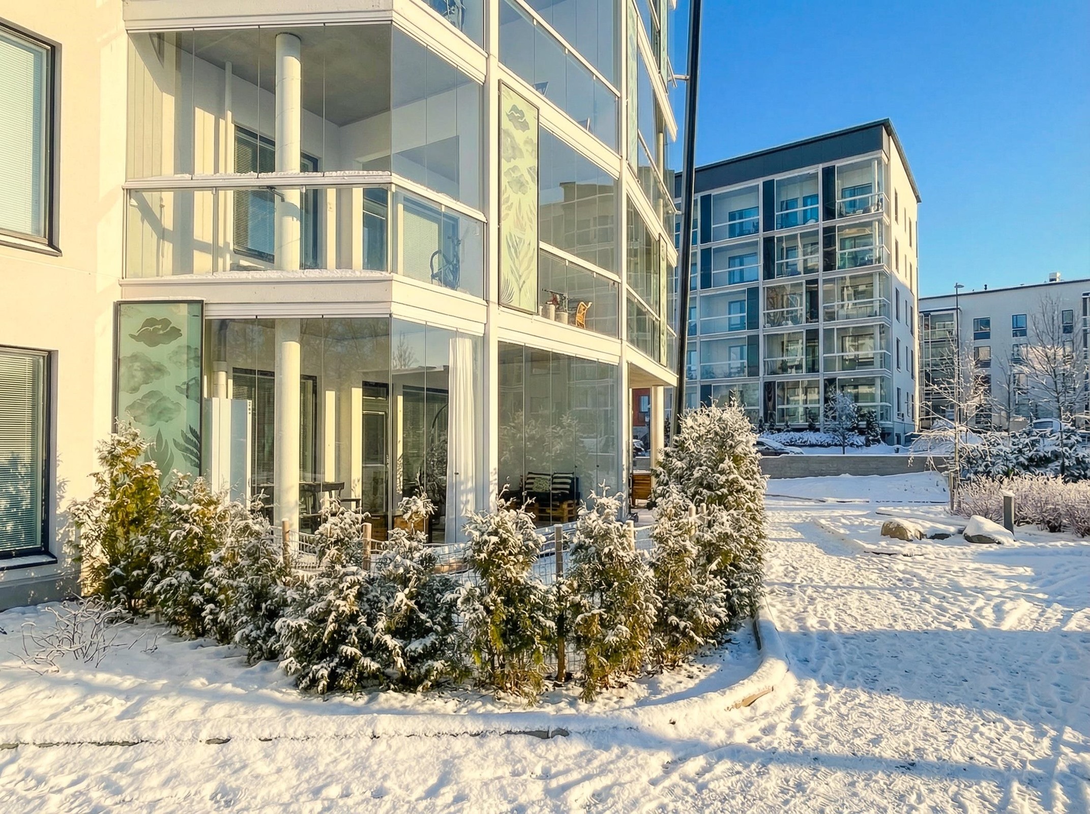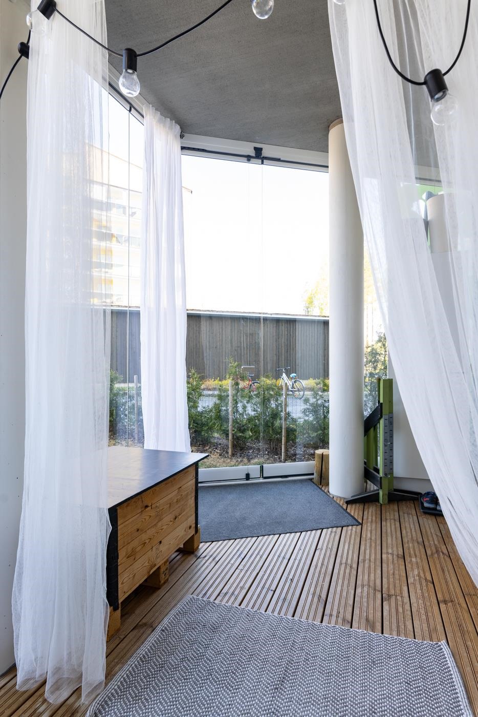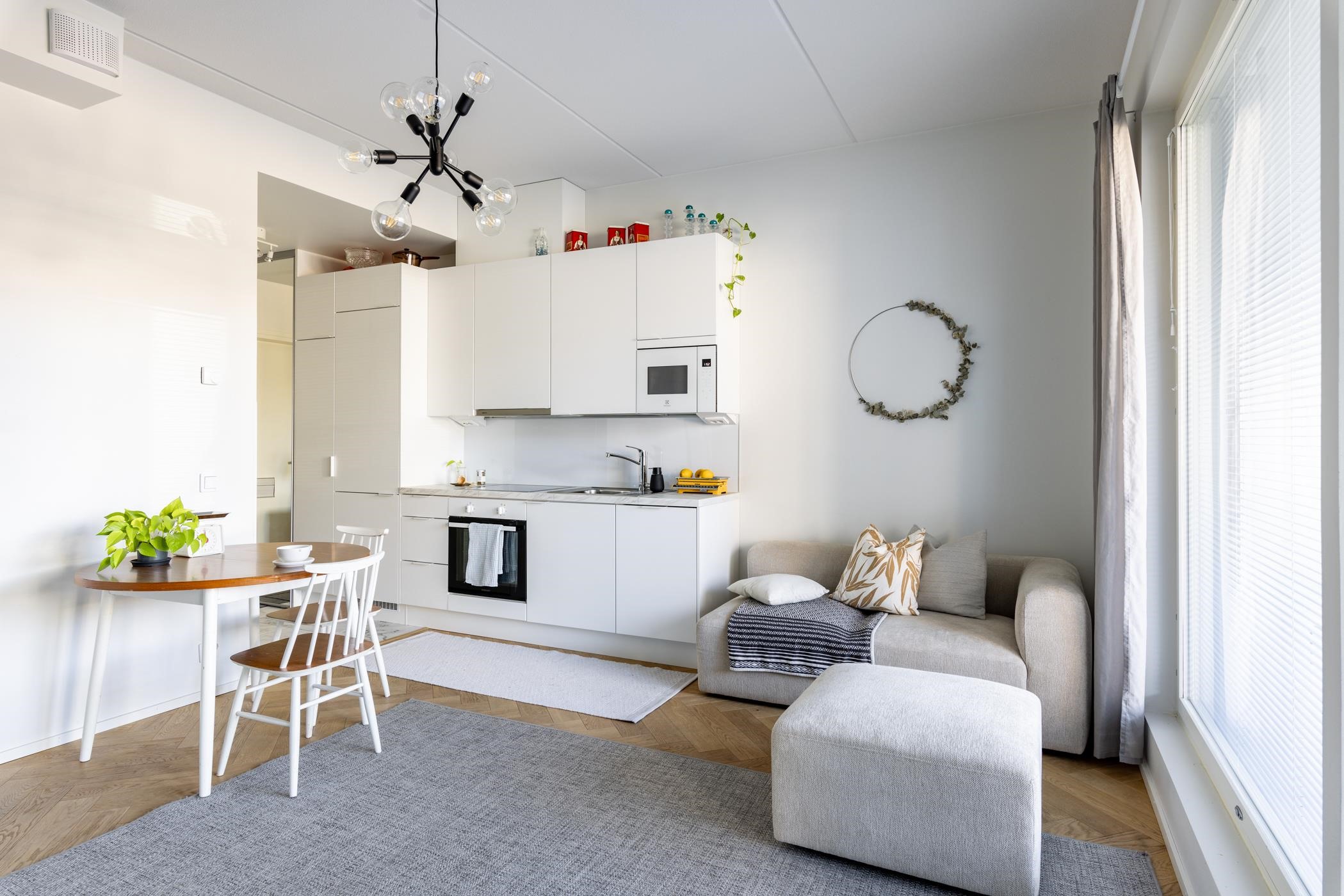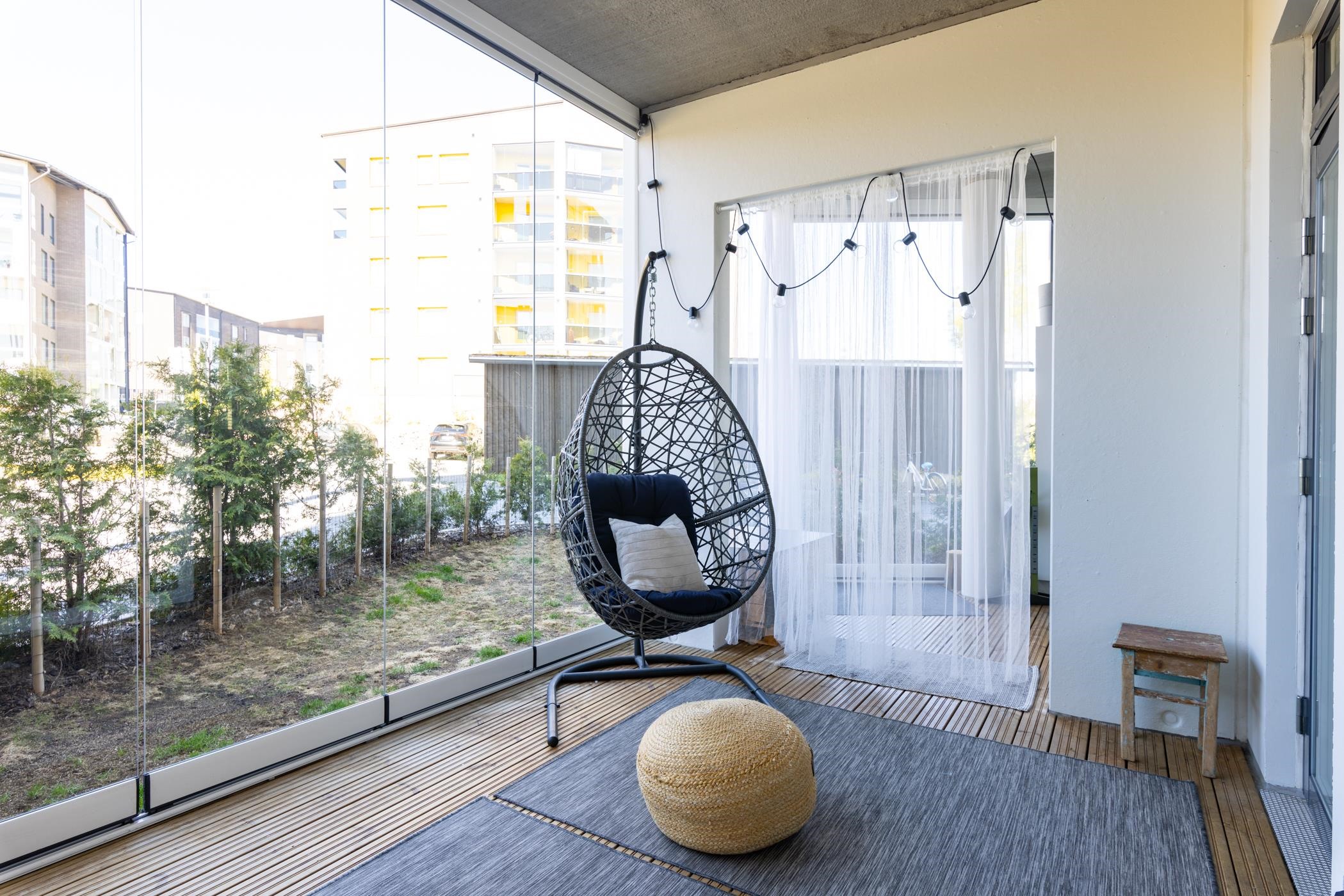 Tämä tyylikäs ja valoisa koti kutsuu uudet asukkaat muuttovalmiina, ja tarjoaa loistavat puitteet mukavaan asumiseen. Luonnonvalo tulvii sisään suurista ikkunoista, ja lasitetulla terassilla kesä alkaa aikaisin ja jatkuu pitkälle syksyyn. Asunnon sisustus on tarkkaan harkittu ja laadukkaat materiaalit ihastuttavat tyylillään. Tässä kodissa on upea kalanruotoparkettilattia, ja eteisen laattalattia toivottaa tervetulleeksi tyylillä. Reilu huonekorkeus lisää avaruuden tuntua, ja vesikiertoinen lattialämmitys takaa mukavuuden ympäri vuoden. Keittiö on varusteltu integroiduilla kodinkoneilla, ja se yhdistyy olohuoneeseen luoden avaran tilan kotoisaan oleskeluun.