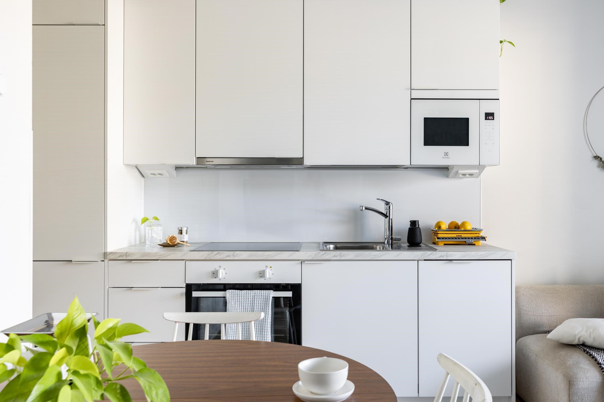 - Keittiössä : Integroitu jääkaappipakastin, integroitu erillisuuni ja liesitaso, liesikupu, integroitu astianpesukone, kaapistot ja kiinteät valaisimet.