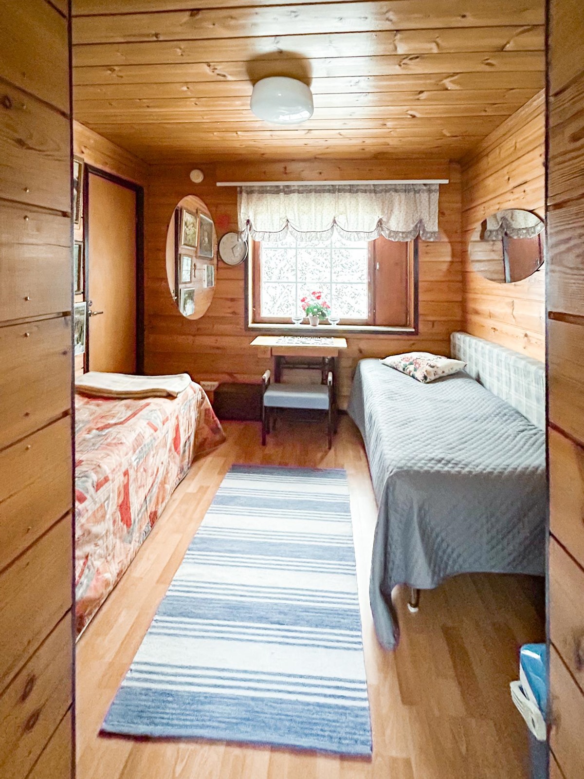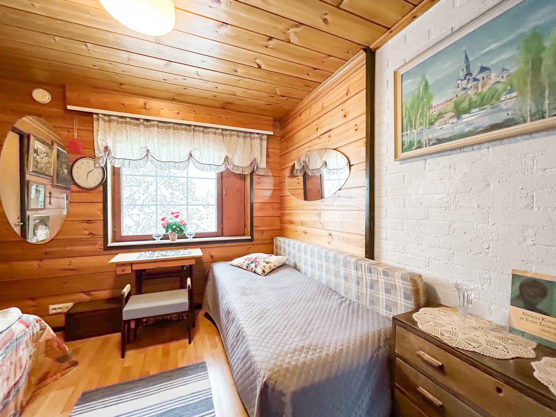 Keittiö: laminaattilattia. maalatut seinät. Olohuone: laminaattilattia, maalatut seinät. Makuuhuone 1: laminaattilattia, paneloidut seinät. Makuuhuone 2: laminaattilattia, maalatut seinät. Sauna: laattalattia, paneloidut seinät. Kylpyhuone: laattalattia, laatoitetut seinät. Wc: muovilattia, laatoitetut seinät.