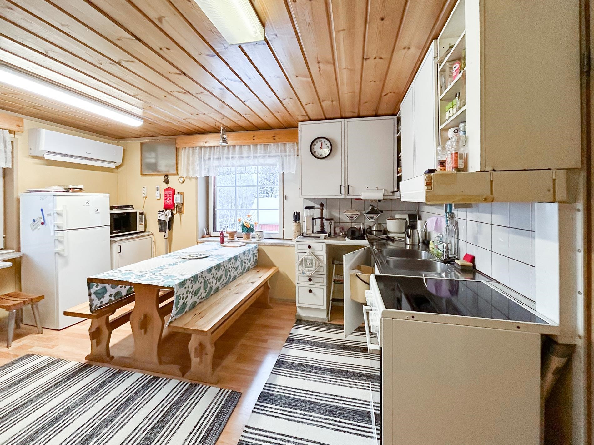 - Jääkaappipakastin, keraaminen liesi, liesituuletin, leivinuuni, mikroaaltouuni, kaapistot.