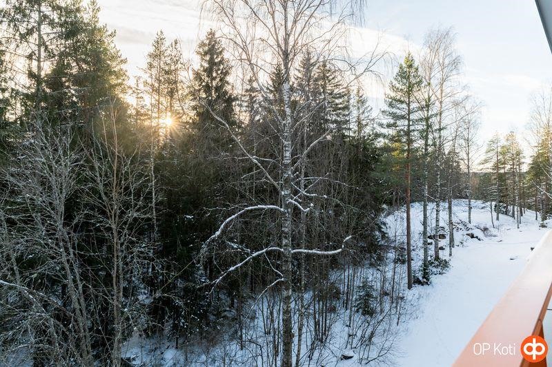 - Lasitettu parveke länteen, metsänäkymin.