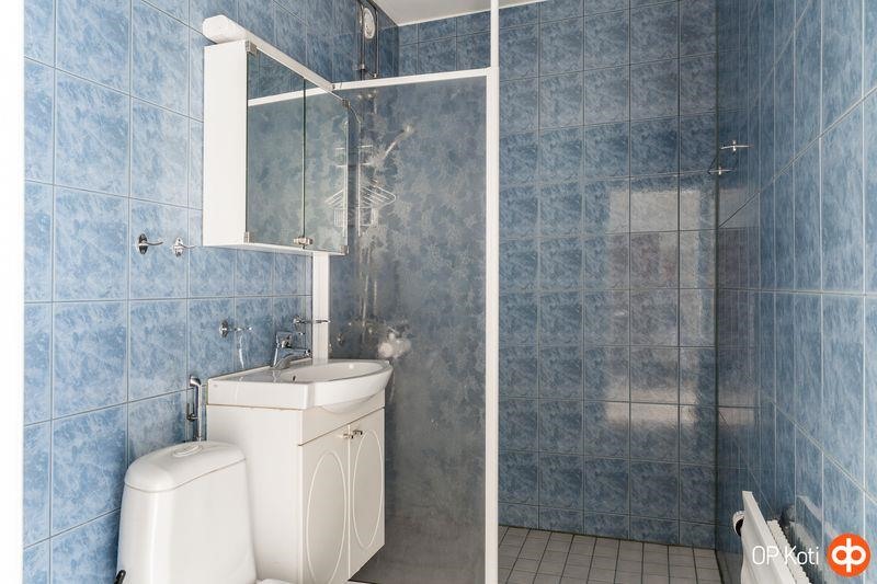 - Kylpyhuone, suihkuseinä, peilikaappi, allaskaappi, pesukoneliitäntä, kiinteät valaisimet.
