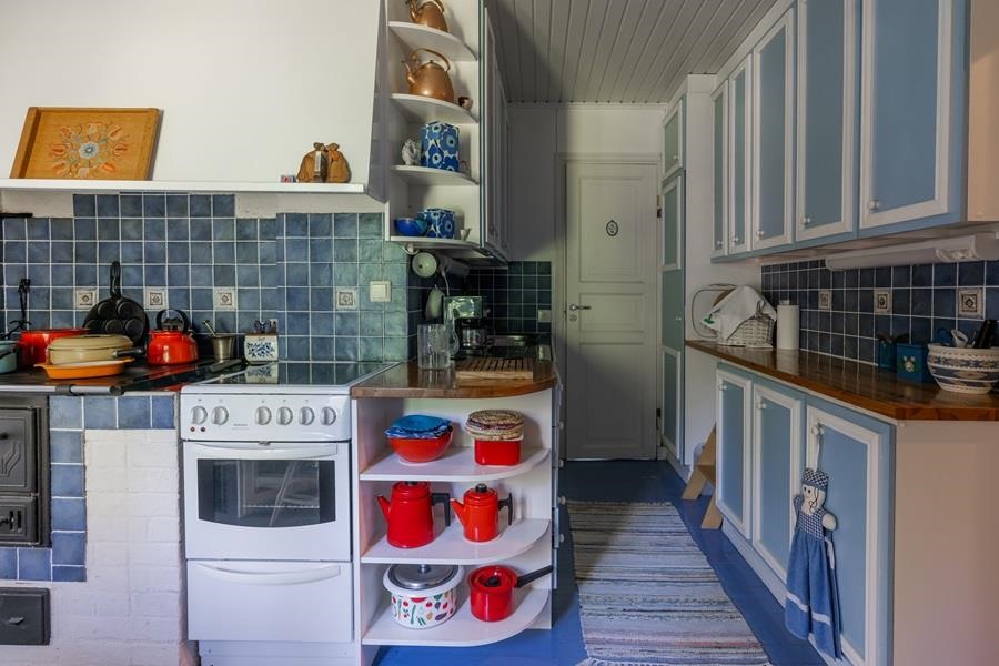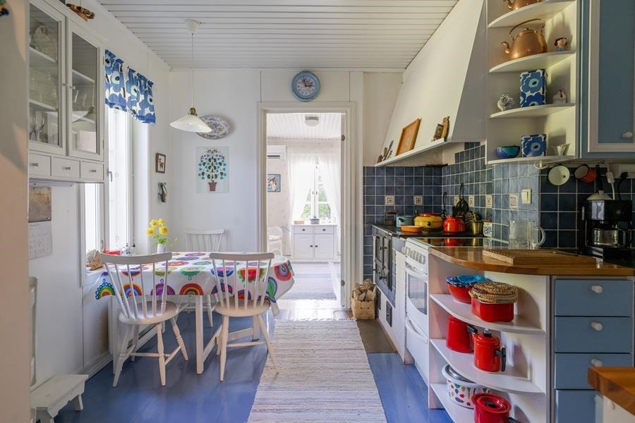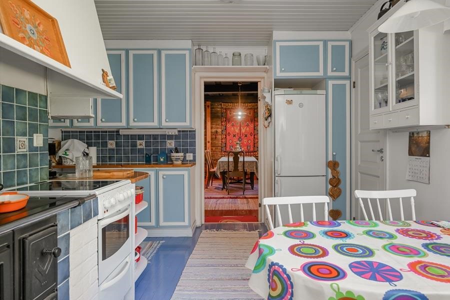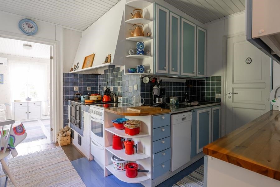 - Keittiössä on jääkaappipakastin, keraaminen sähköliesi, liesituuletin, astianpesukone, puuhella, mukavasti kaapistoja ja työtasoa. Keittiön vieressä on vanha ns. ruokakomero, joka toimii hyvin apukeittiönä.