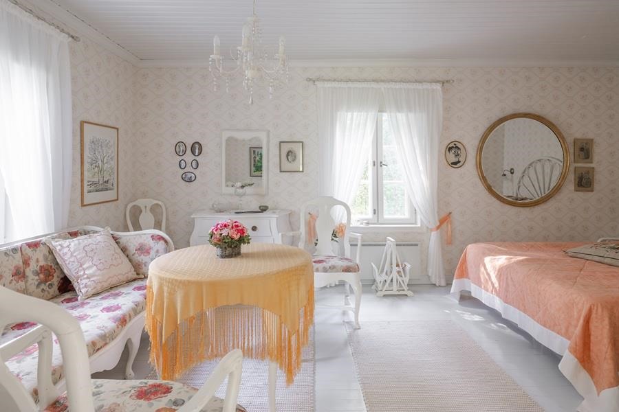 Päärakennuksessa on asuintiloissa lautalattiat, seinissä tapetti, maali tai upea hirsiseinä. Kylpyhuoneen lattiaan tulee uusi muovimatto ja seinissä on osin sormipaneeli ja osin laatoitus.
