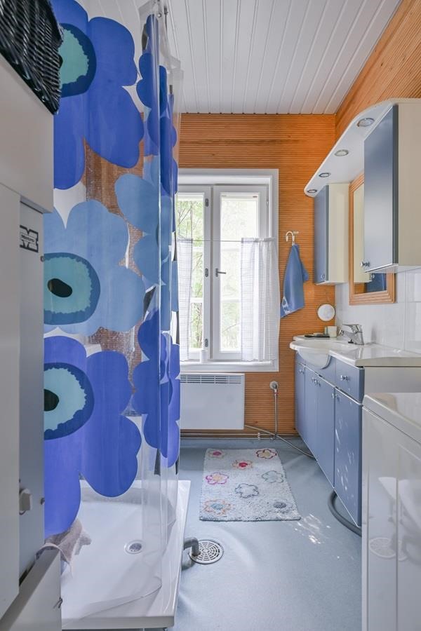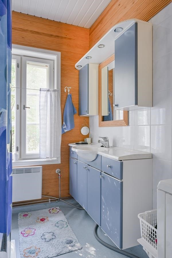 - Päärakennuksessa on kylpyhuone, jossa on lattiamaton vaihto meneillään. Kylpyhuoneessa on suihku, lavuaari allaskaapilla, kaapistoja sekä pöytätasoa, wc-istuin, pyykinpesukone ja sinne asennetaan uusi lämminvesivaraaja. Pihassa on noin vuonna 1940 rakennettu 10 neliön sähköistetty saunarakennus, jossa pukuhuone ja sauna. Saunan puolella on puilla lämpiävä kiuas ja erillinen vesipata. Lisäksi pihassa vuonna 2010 nykyiselle paikalle vanhoista hirsistä rakennettu noin 15 neliön savusauna.