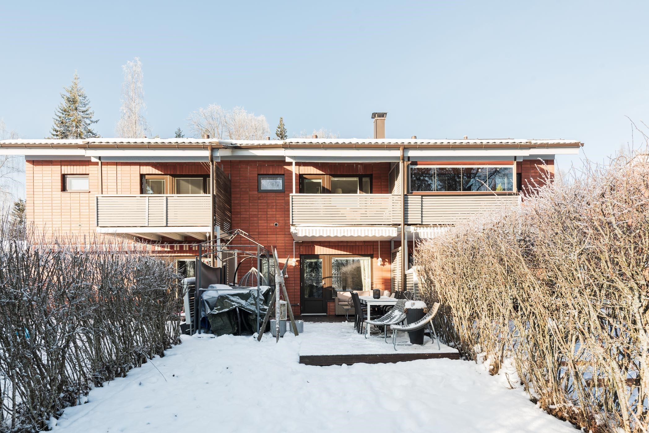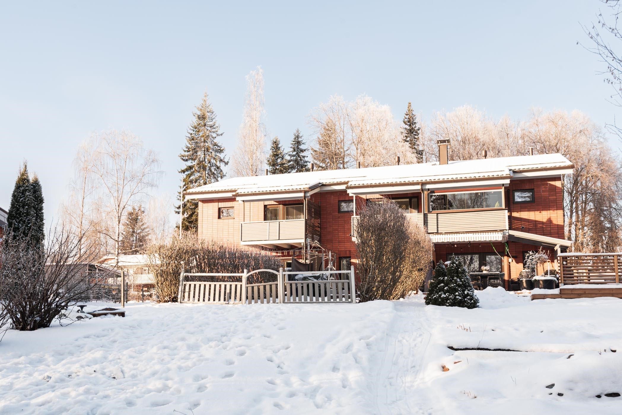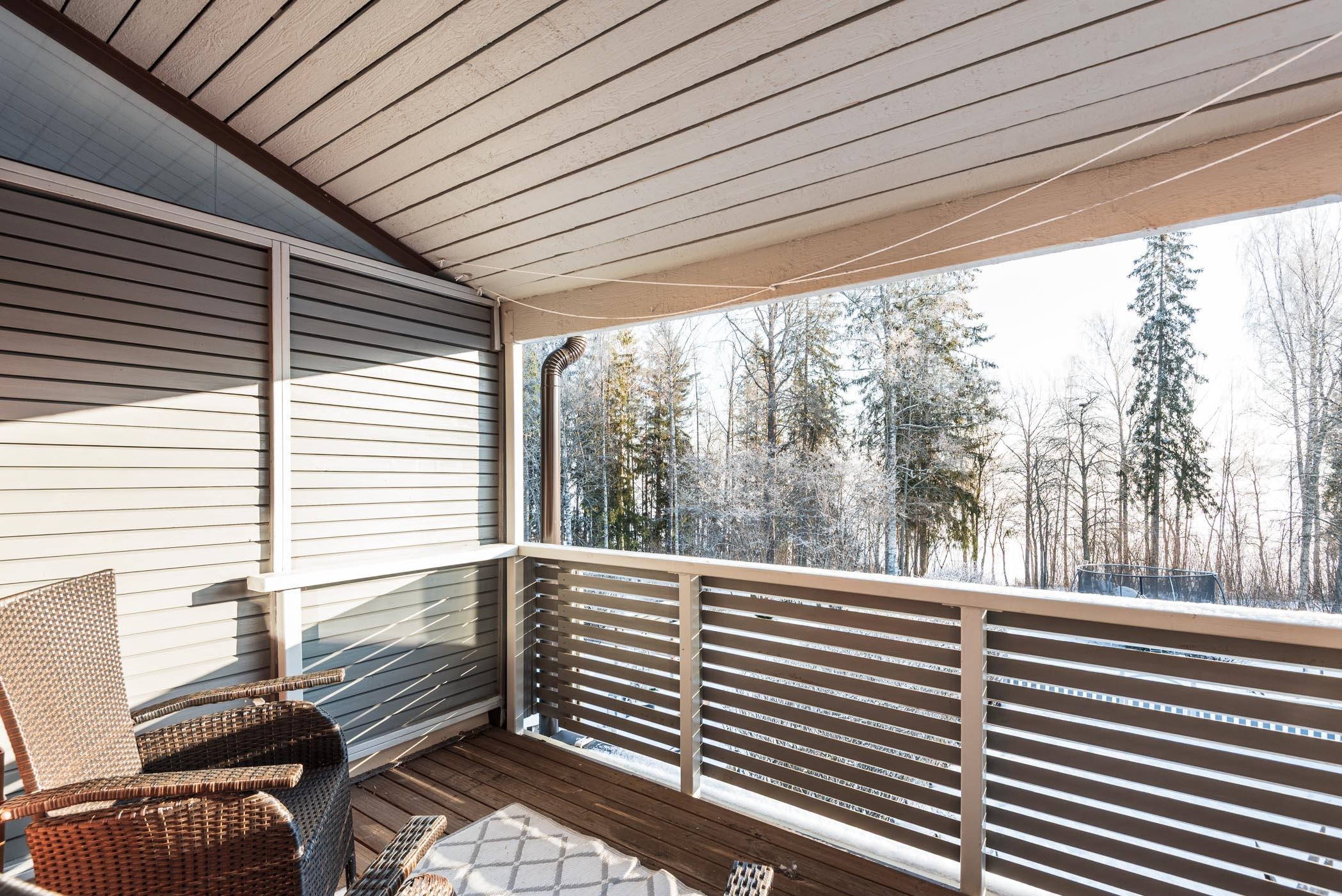 - Olohuone, yksi makuuhuone, sauna, takapiha terasseineen ja parveke etelään, Pyhäjärven suuntaan. Keittiö ja kaksi makuuhuonetta pohjoiseen.