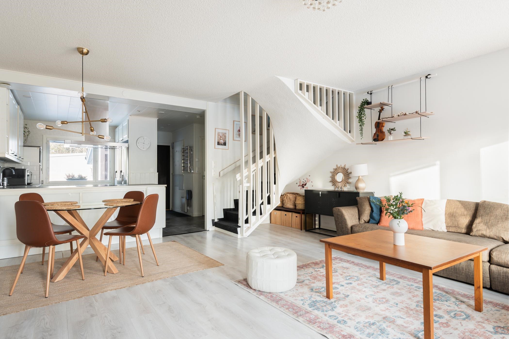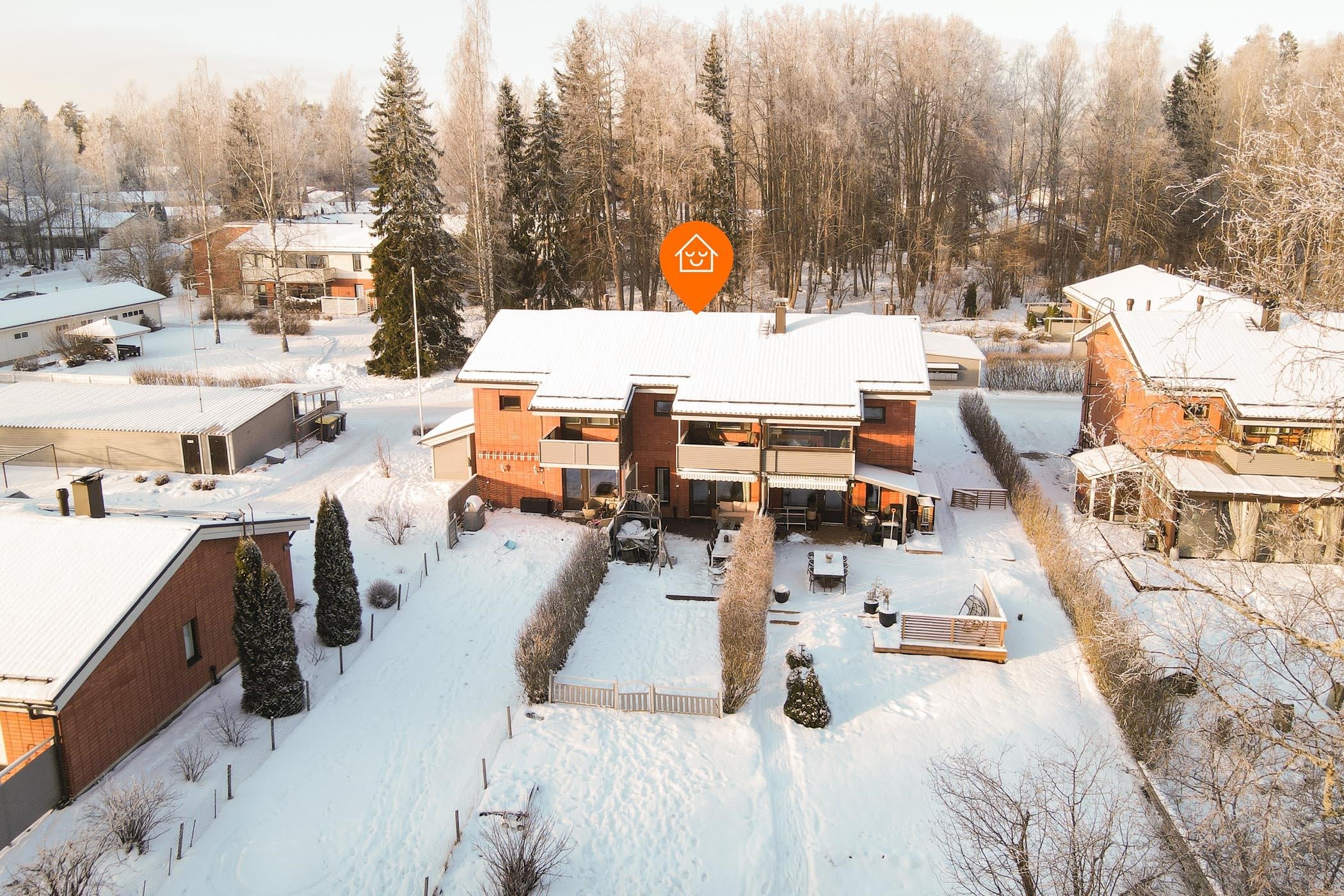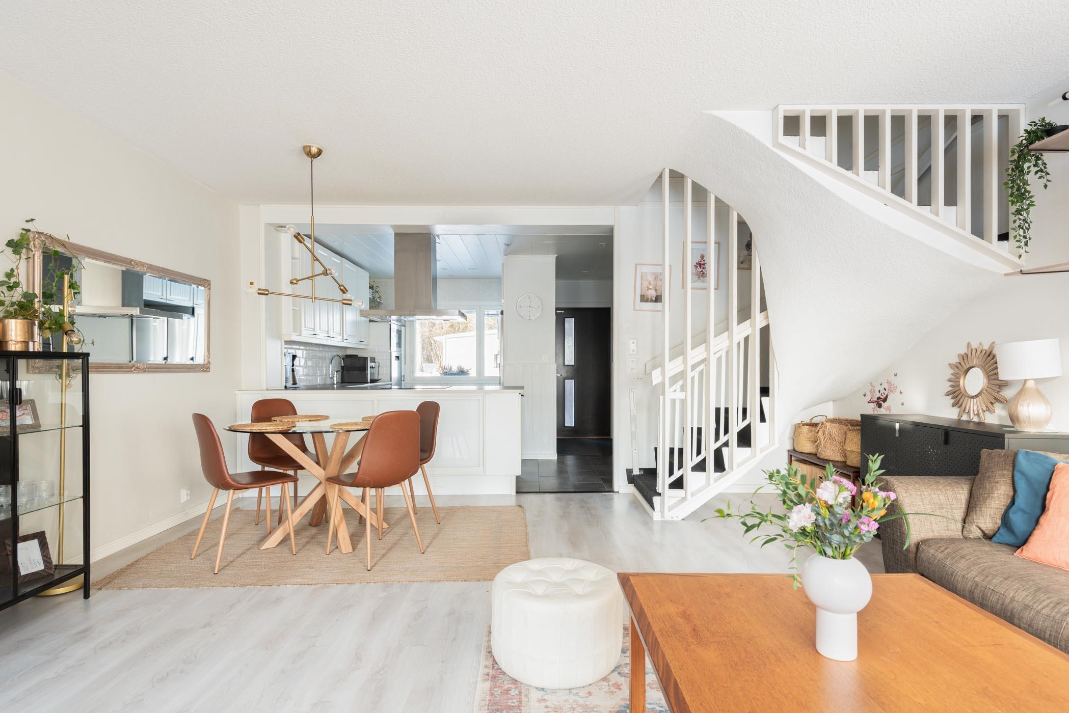 Kodin 96 neliötä jakautuvat toimivasti kahteen kerrokseen. Alakerran saarekkeellisessa keittiössä on laadukkuutta; kalusteeseen integroitu mikro, induktioliesitaso sekä erillisuuni tekevät ruoanlaitosta nautinnon. Tilavassa olohuoneessa ja ruokailutilassa on runsaasti tilaa yhdessäoloon - isompikin ystäväporukka mahtuu pöydän ääreen nauttimaan. Yläkerrassa sijaitsevat makuuhuoneet tarjoavat puolestaan rauhalliset puitteet levolle. Saunaosaston vuonna 2024 uusittu kiuas kutsuu rentoutumaan ja vilvoitella voit myös yläkerran parvekkeella. Kylpyhuoneessa ja wc:ssä on lattialämmitys, ja arjen sujuvuutta lisäävät vaatehuone, ulkovarasto sekä kaksi autopaikkaa. Kodin varustukseen kuuluu myös ilmalämpöpumppu ja valokuituyhteys.
