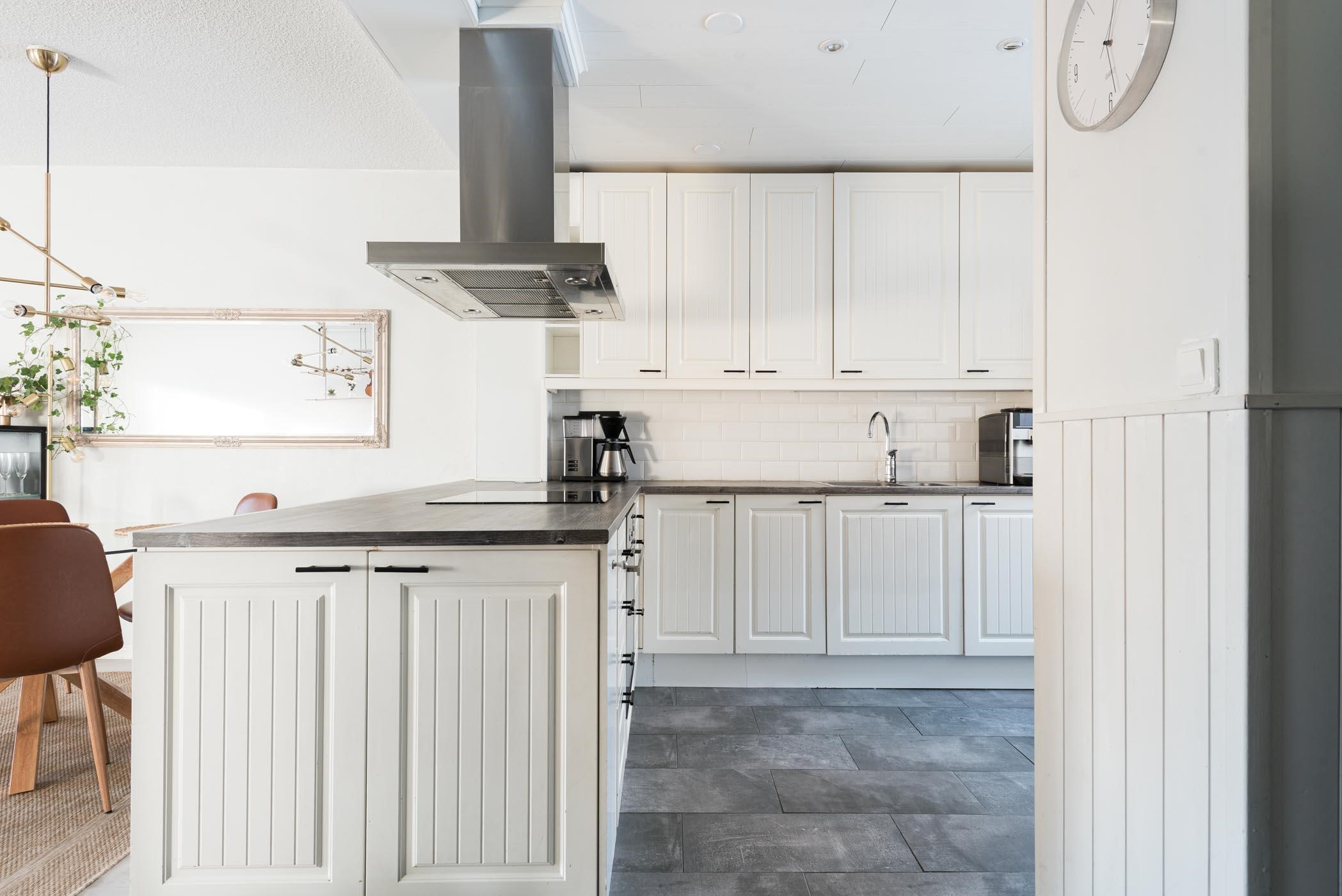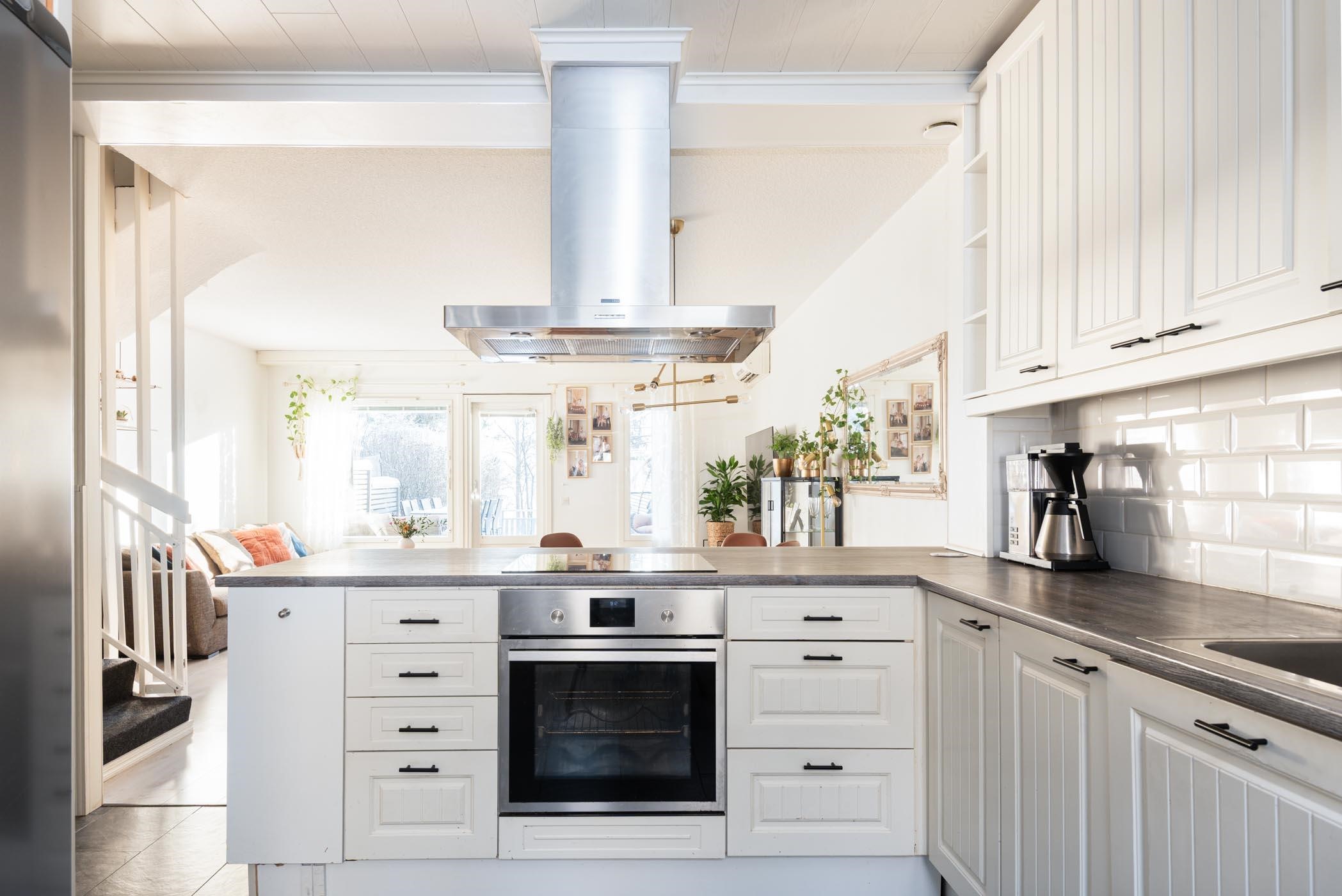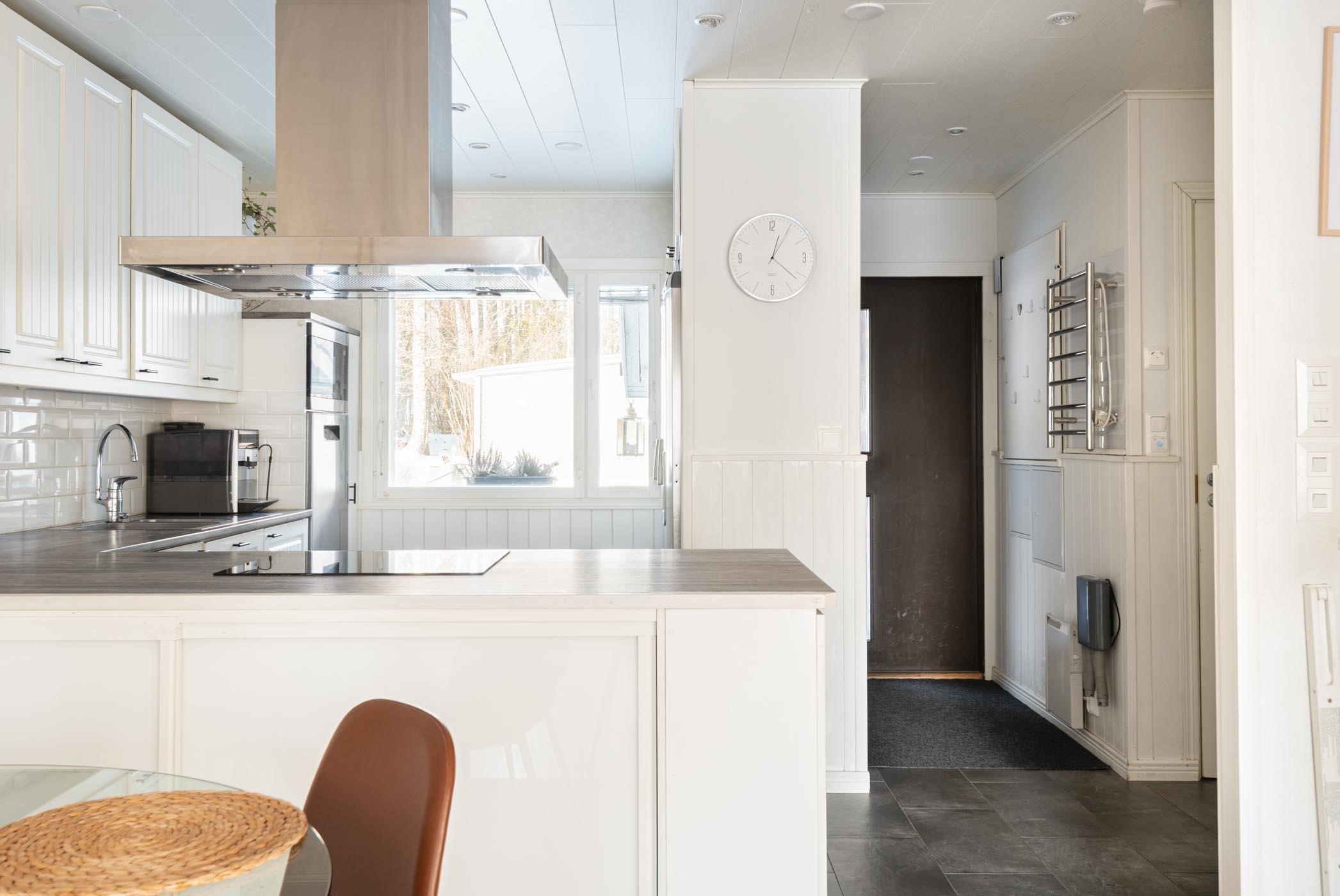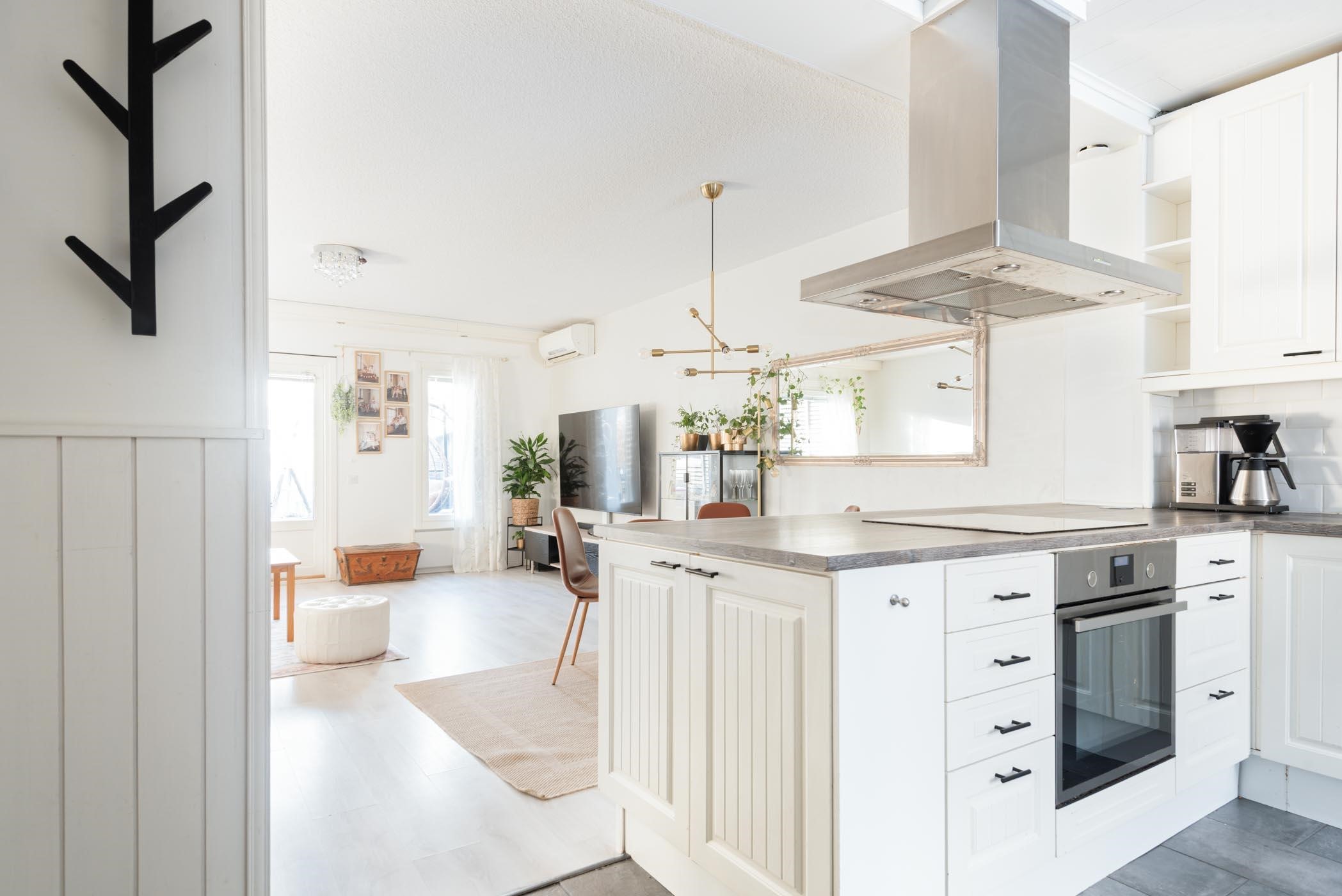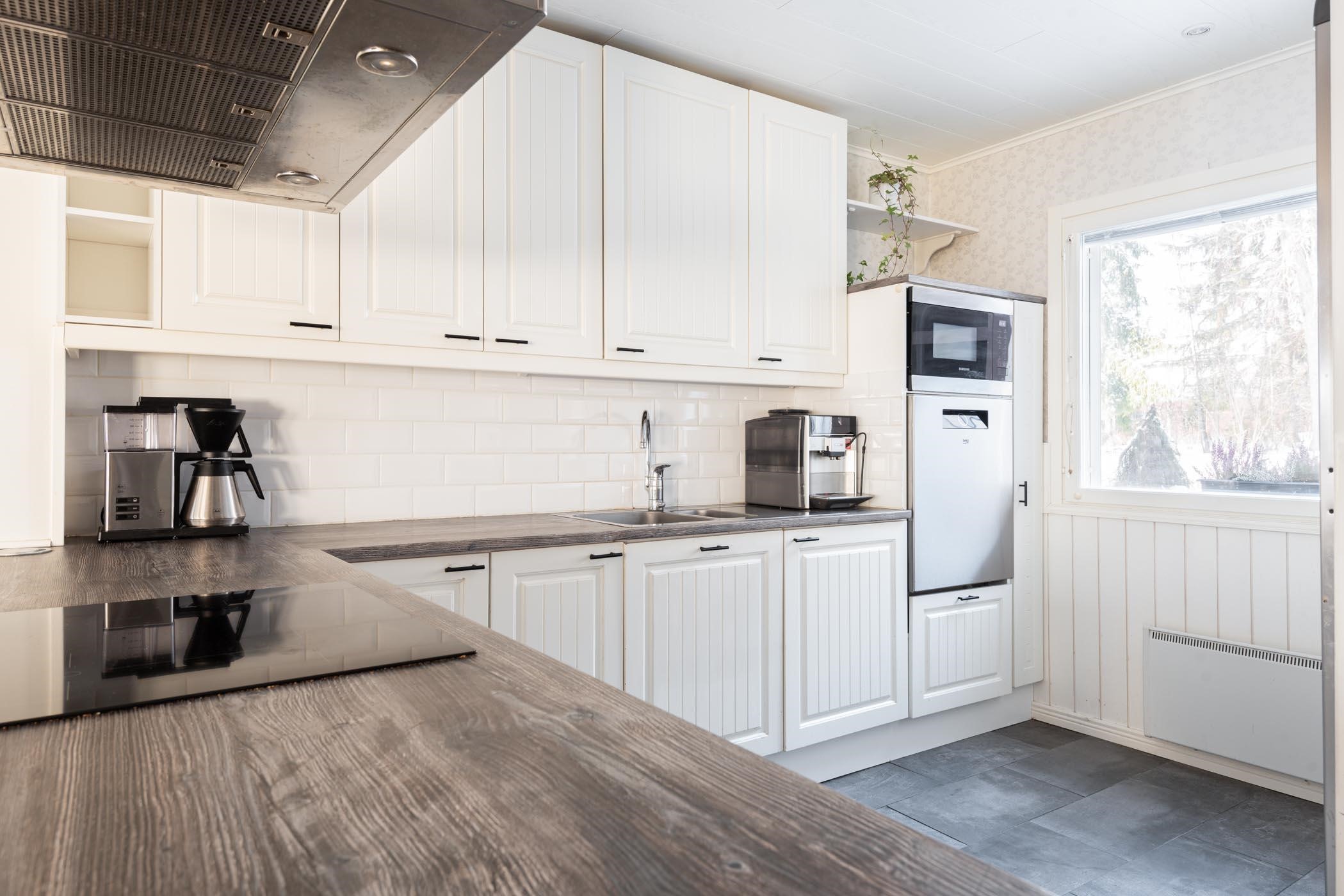 - Saarekkeellisen keittiön varusteisiin kuuluvat korkea jääkaappi ja pakastekaappi, erillisuuni, induktioliesitaso, liesituuletin, kalusteeseen integroitu miksoaaltouuni ja kiinteät valaisimet.