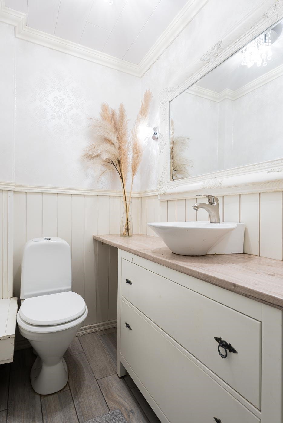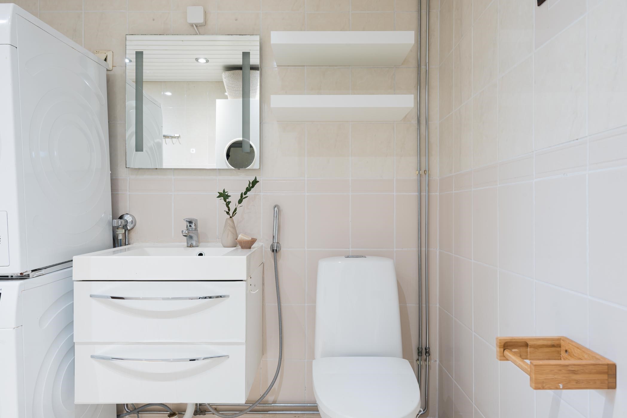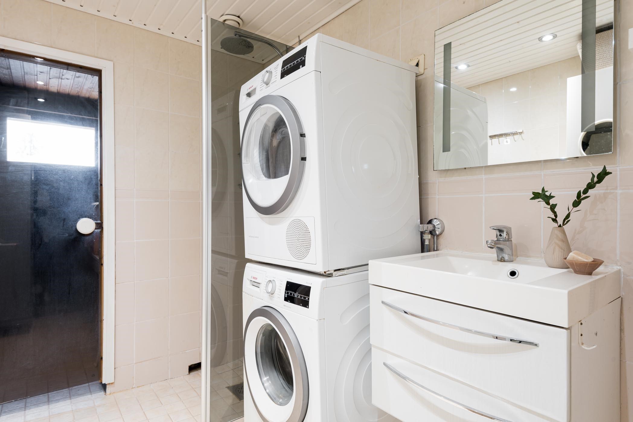 - Saunassa on sähkökiuas. Kylpyhuoneessa on suihkuseinä, suihku, valopeili, allaskaappi, pesukoneliitäntä (varaus pesutornille), bidee ja pyykkikaappi. Erillisessä wc:ssä on peili, allaskaappi ja bidee. Lattialämmitys kylpyhuoneessa ja wc:ssä.