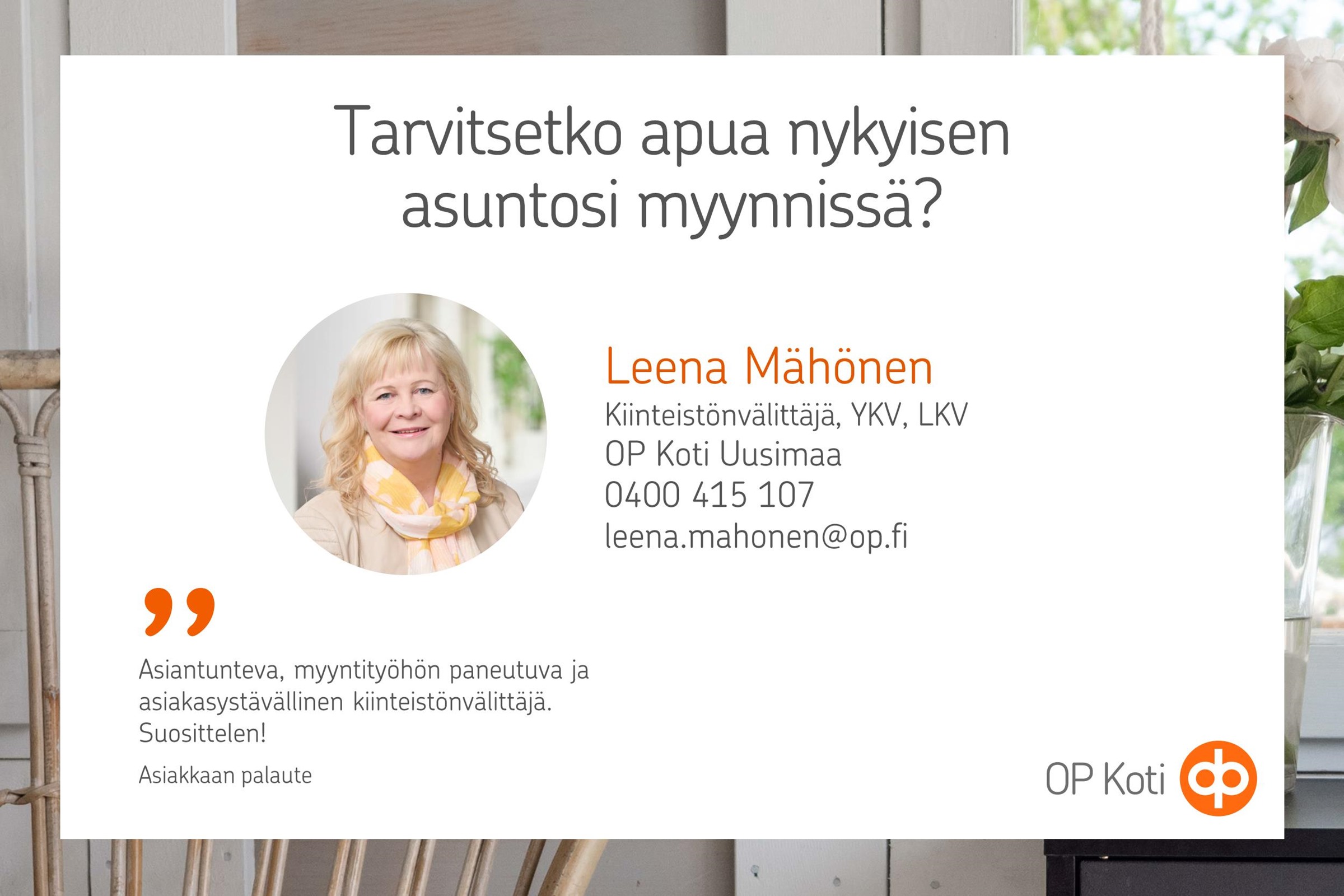 Tämä kokonaisuus on ehdottomasti nähtävä paikan päällä. Tervetuloa tutustumaan,ihastut varmasti. Sovi yksityisesittely! Leena Mähönen, YKV, LKV, Kiinteistönvälittäjä. puh. 0400415107. sp. leena.mahonen@op.fi Kiinteistönvälitystä jo 37 vuoden kokemuksella!