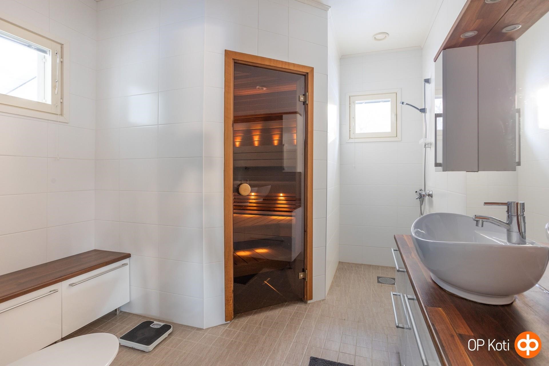 - Sauna, kylpyhuone, erillinen wc 2 kpl, suihku, peilit kh;ssa, peilikaappi wc;ssä, allaskaappi wc;ssä, pesukoneliitäntä, lattialämmitys, kiinteät valaisimet. Kh remontoitu 2022