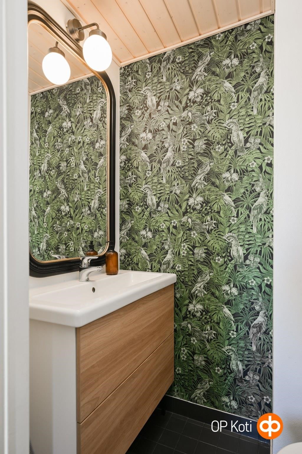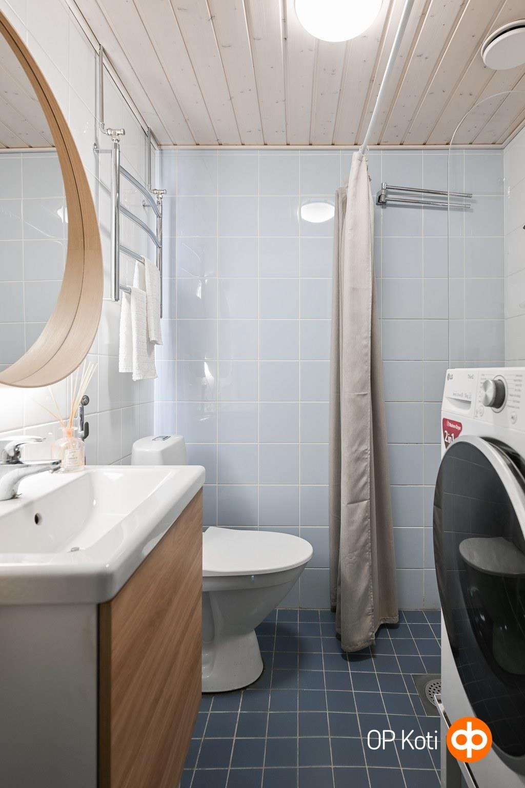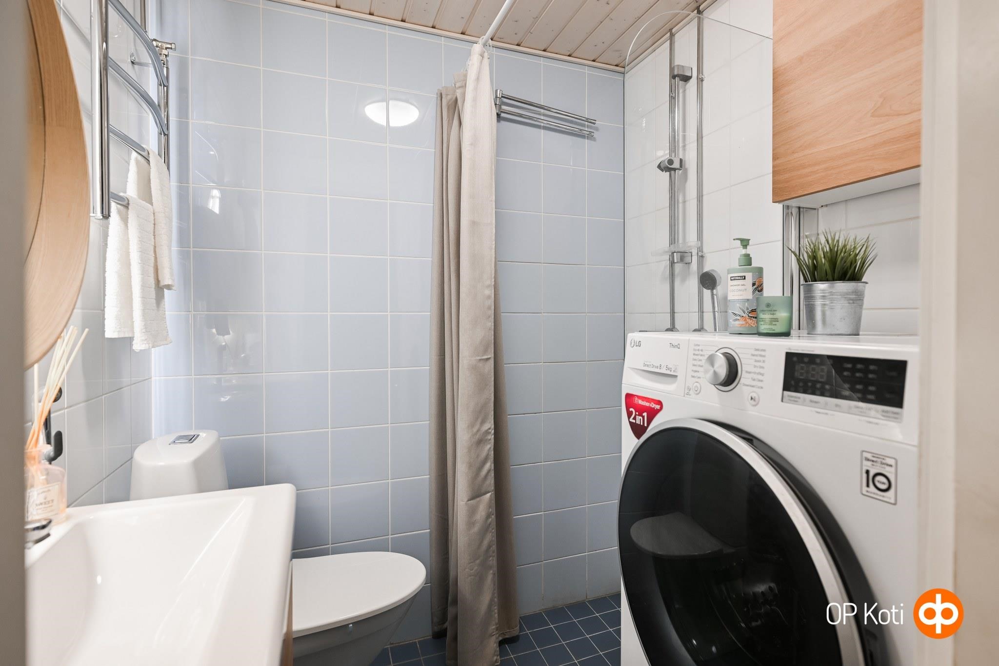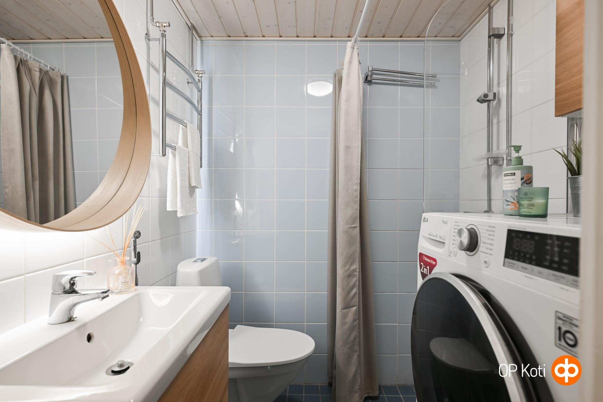- Kylpyhuone, erillinen wc, suihkuseinä, peilit x2, allaskaappi kh+wc, pesukoneliitäntä, rättipatteri, kiinteät valaisimet.