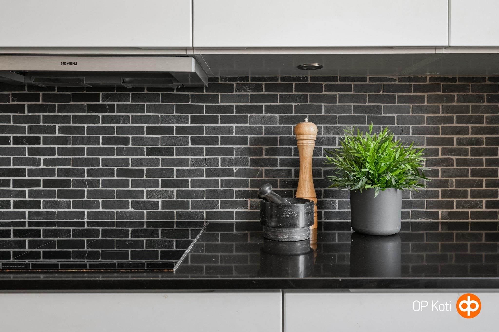 - Jääkaappi, pakastekaappi, erillisuuni, liesitaso, induktioliesi, liesituuletin aktiivihiilisuodatin, mikroaaltouuni integroitu, astianpesukone, kaapistot, kiinteät valaisimet.