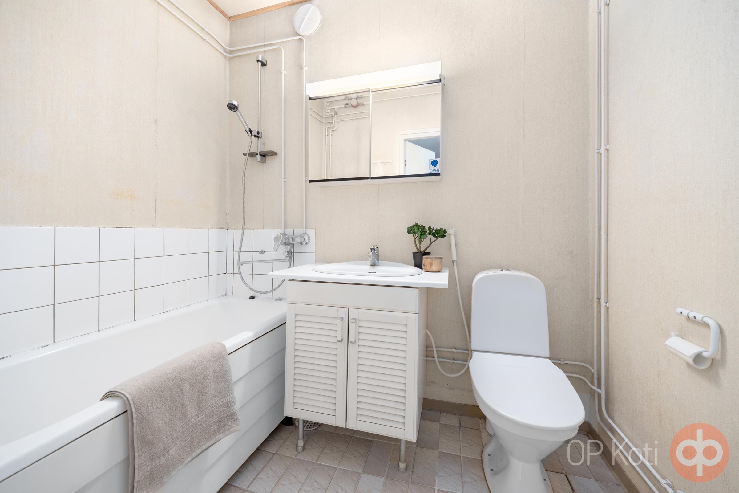 - Kylpyhuone, suihku, amme, peilikaappi, allaskaappi, pesukoneliitäntä, kiinteät valaisimet.