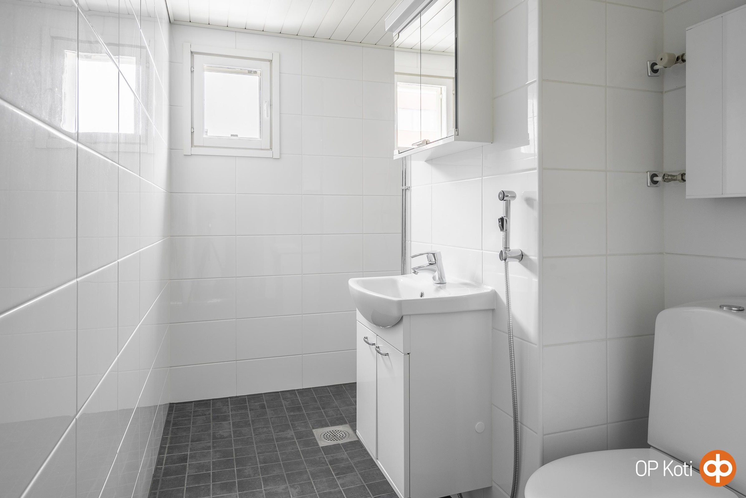 - Kylpyhuone, suihku, peilikaappi, kaapit, allaskaappi, pesukoneliitäntä, kiinteät valaisimet. bidee-suihku