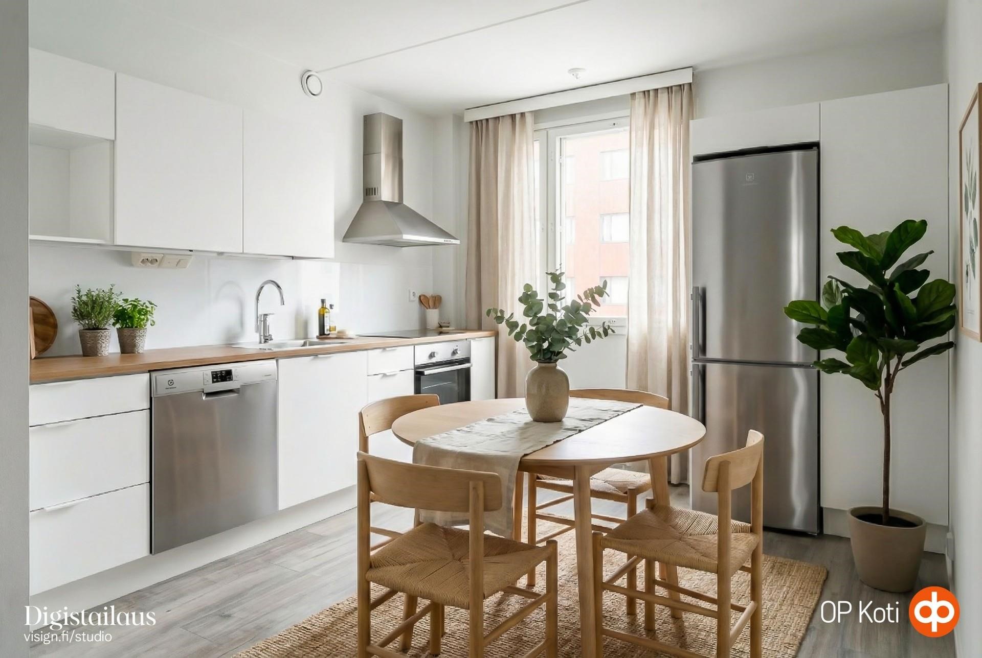 - Jääkaappipakastin, erillisuuni, liesitaso keraaminen, liesituuletin aktiivihiili, astianpesukone, kaapistot, kiinteät valaisimet.