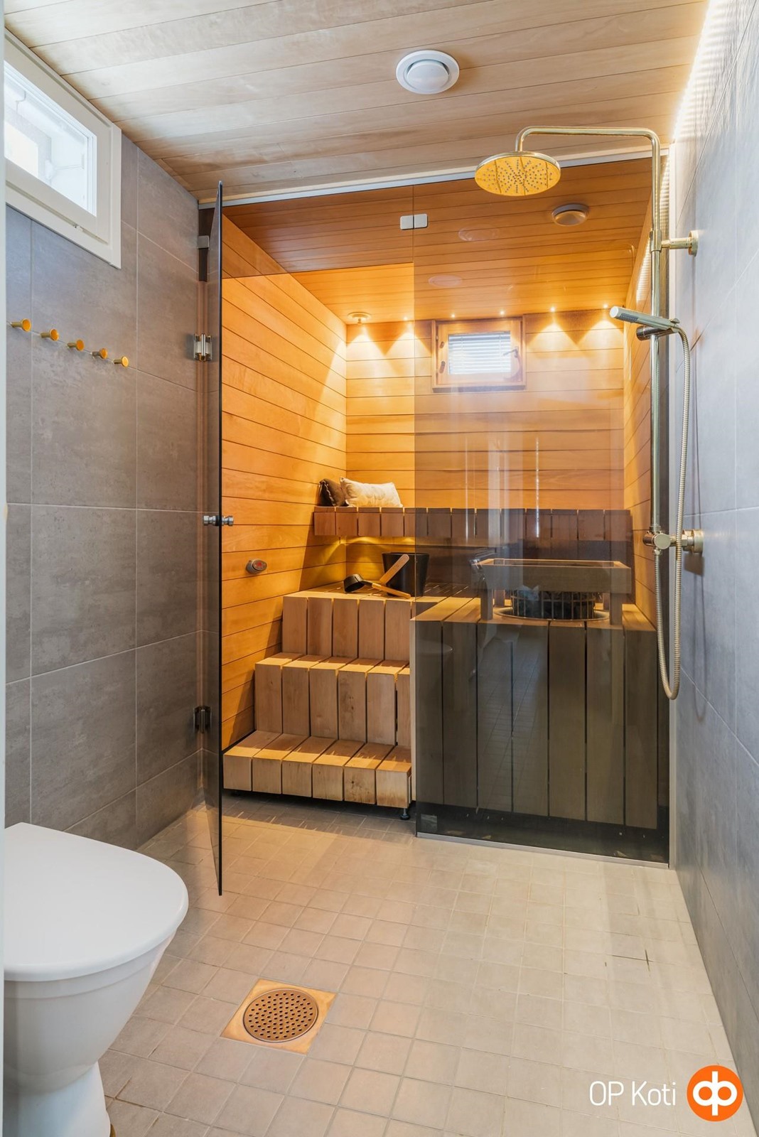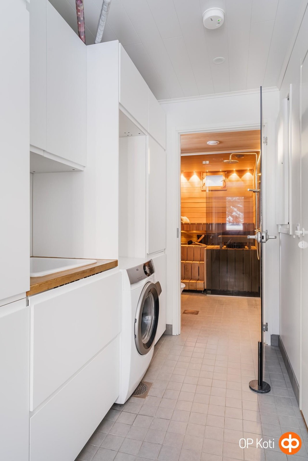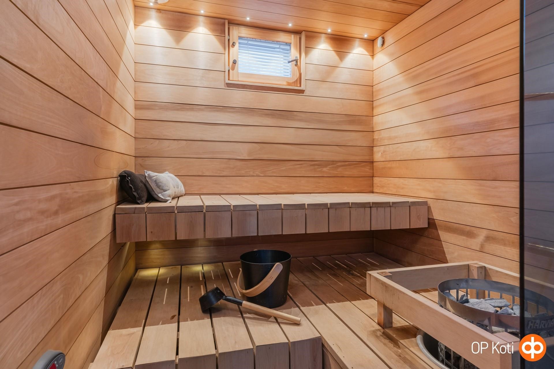 - Sauna, sähkökiuas, kylpyhuone, erillinen wc, suihku, peilit, allaskaappi, pesukoneliitäntä, lattialämmitys, kiinteät valaisimet.
