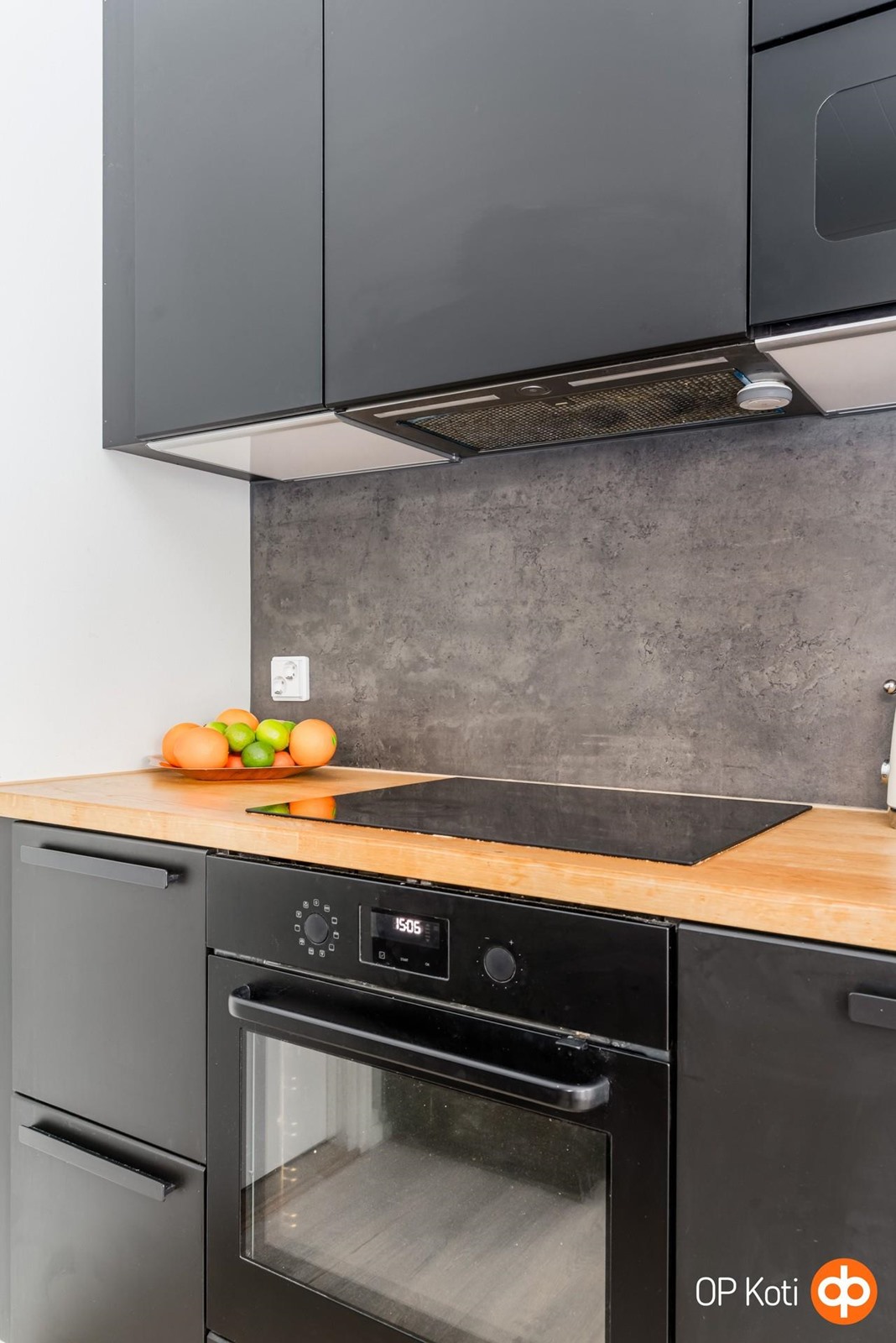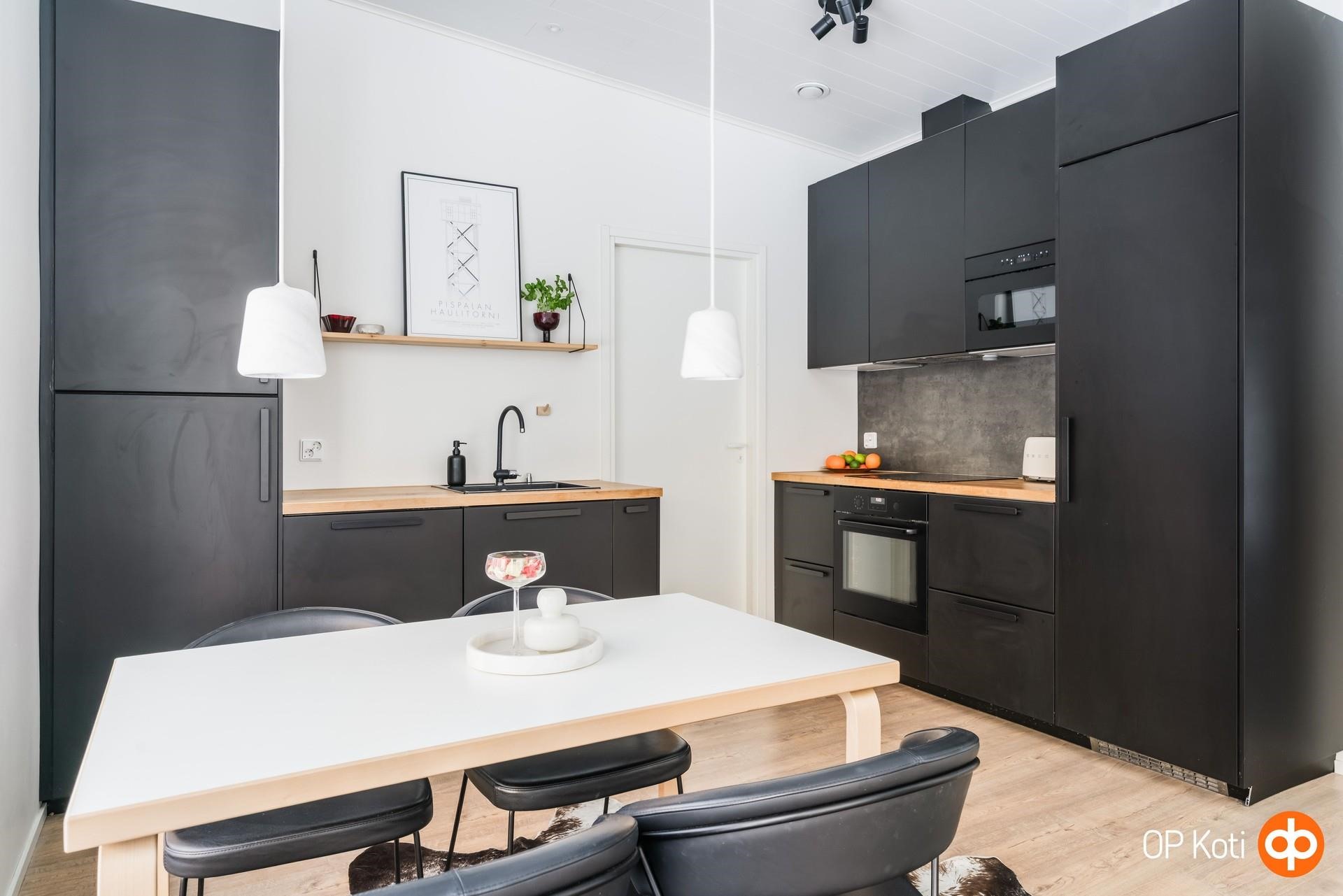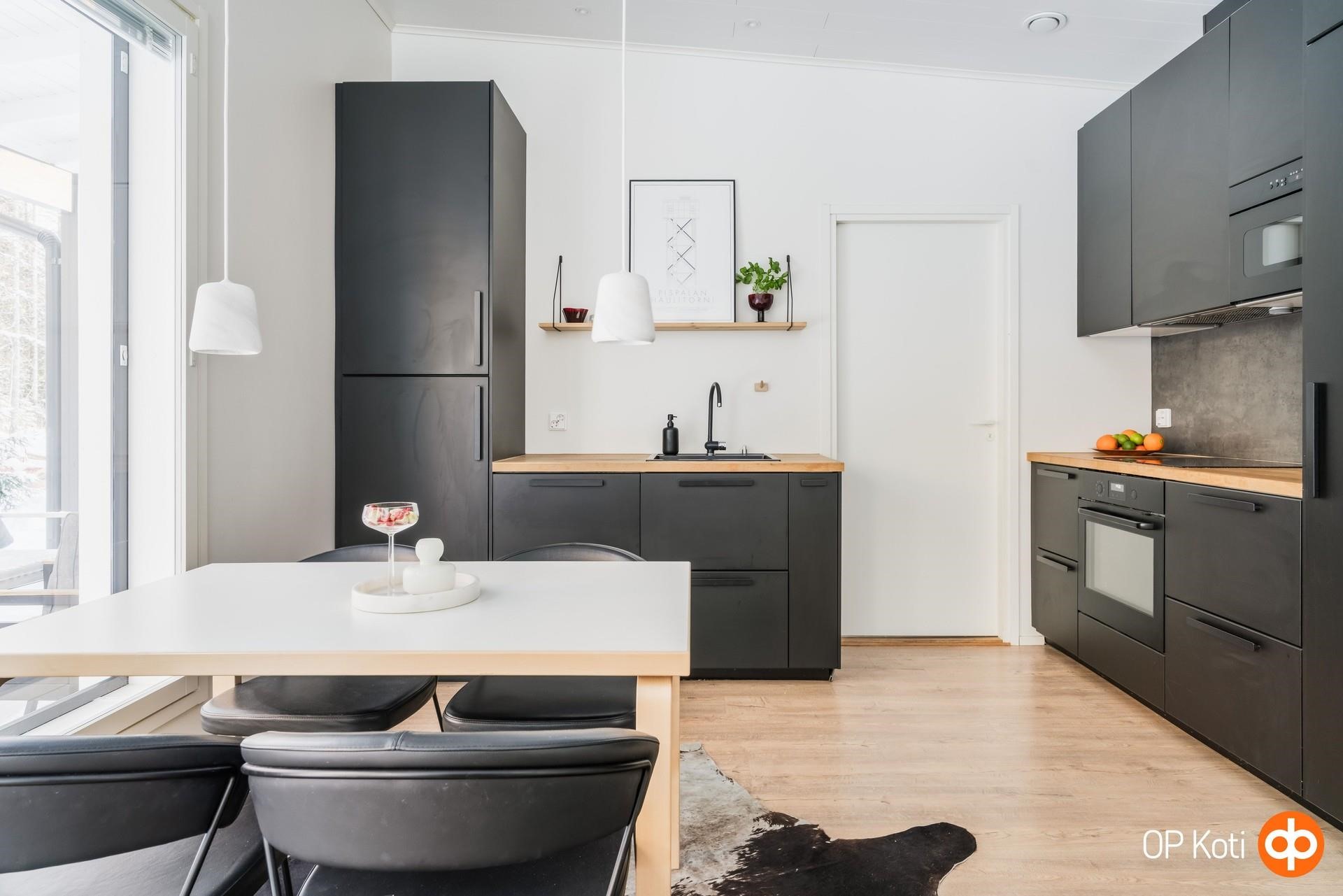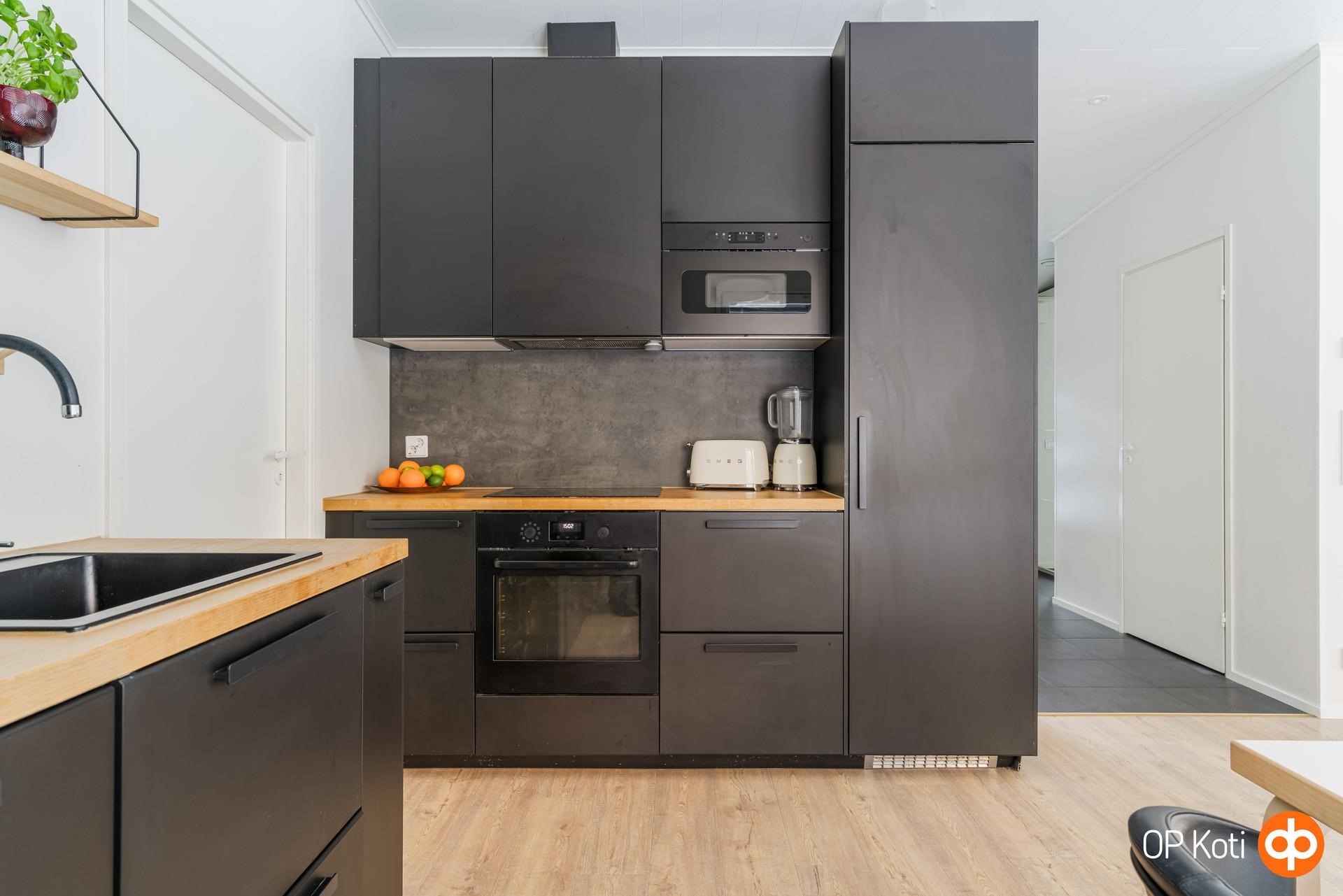 - Jääviileäkaappi, induktioliesi, liesituuletin, mikroaaltouuni integroitu, astianpesukone integroitu, kaapistot, kiinteät valaisimet, pöytätasojen materiaali Puu. Pakastin kodinhoitohuoneessa