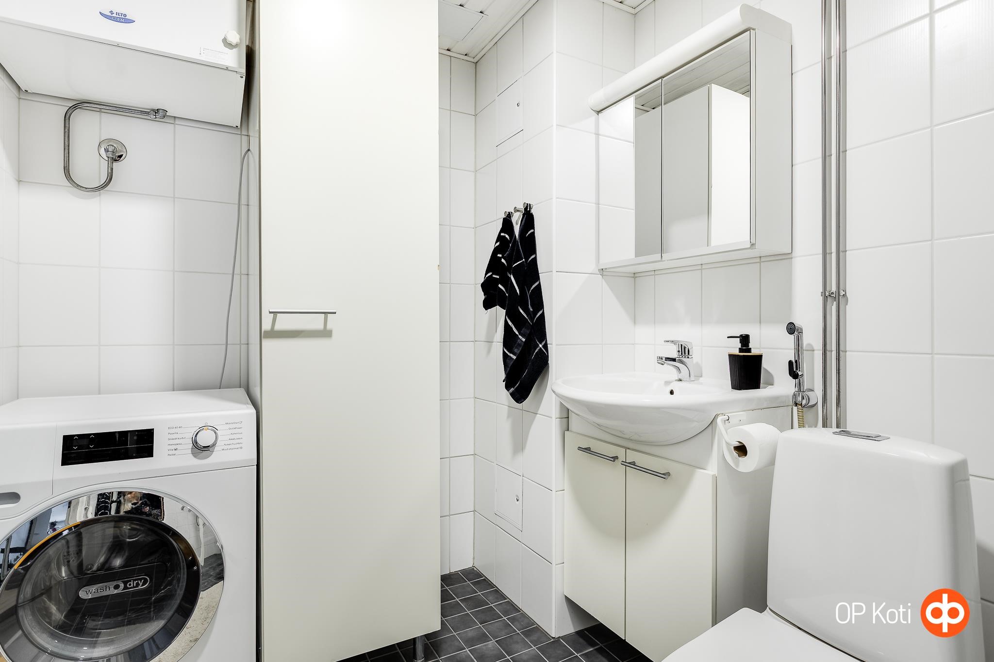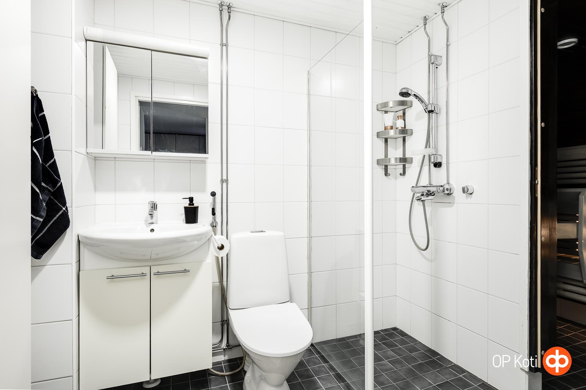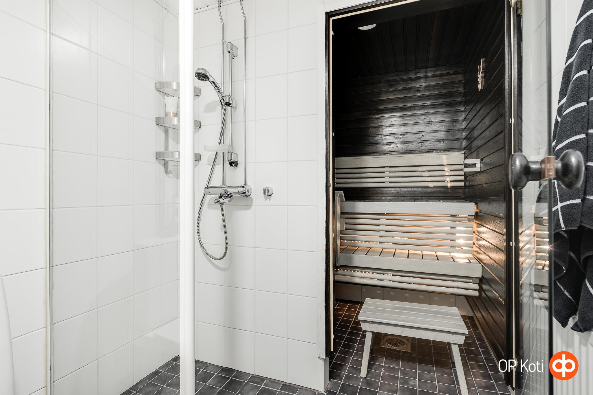 - Sauna, sähkökiuas, kylpyhuone, suihku, peilikaappi, kaapit, allaskaappi, pesukoneliitäntä, kiinteät valaisimet.