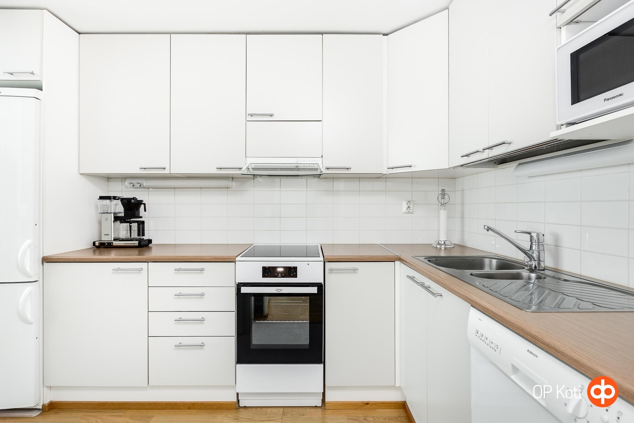 - Jääkaappipakastin, keraaminen liesi, liesituuletin, astianpesukone, kaapistot, kiinteät valaisimet.